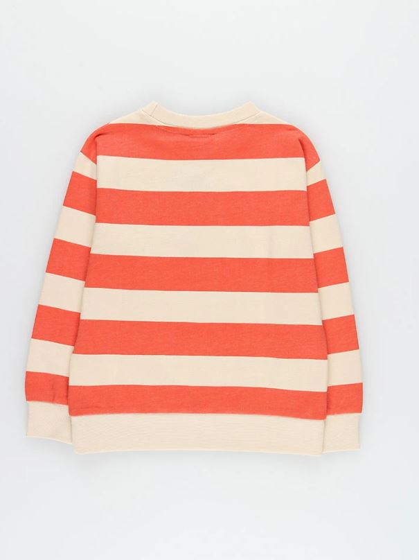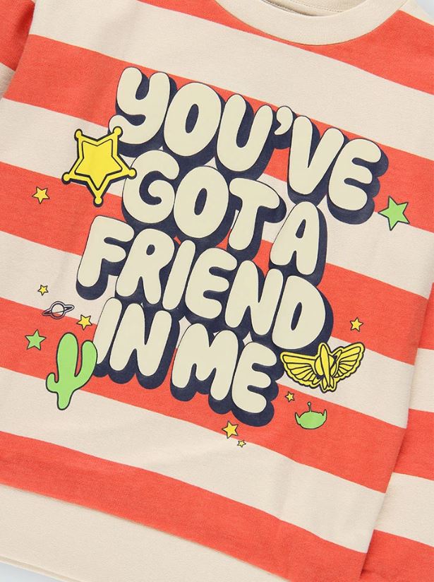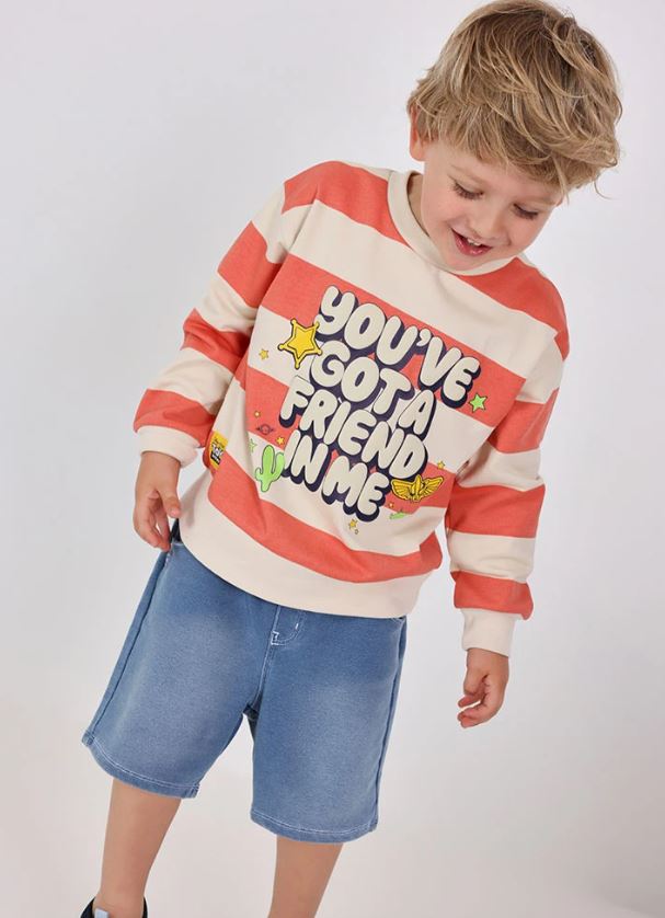 Esta sudadera de felpa para niña y niño es una opción cálida y cómoda para los días más frescos. Presenta un diseño listado en tonos rojo coral y crudo, con detalles inspirados en Toy Story que añaden un toque divertido al conjunto. De manga larga y sin capucha, es ideal para llevar a la escuela o para un paseo al aire libre. Su tejido de algodón suave proporciona abrigo sin perder ligereza.