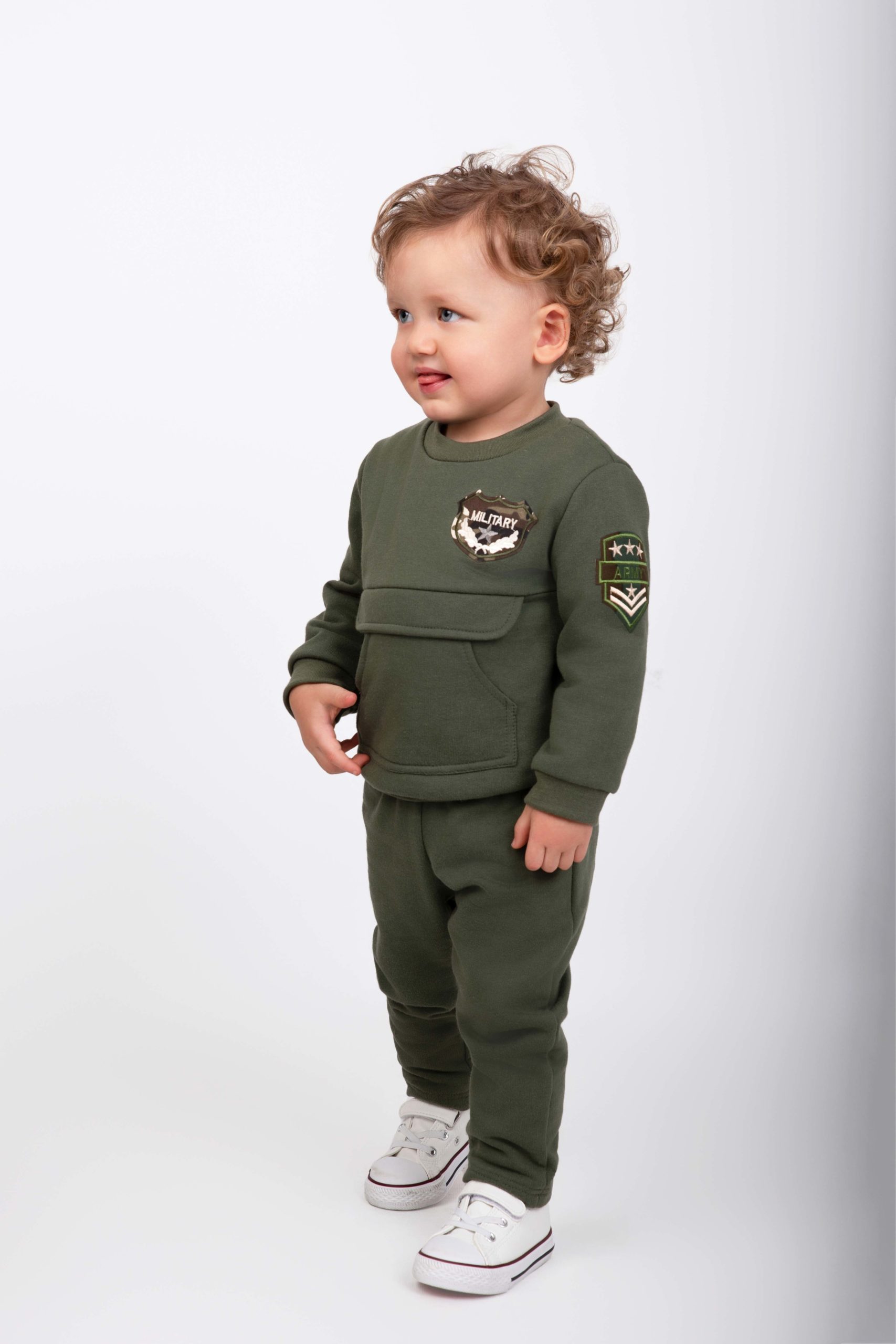 Conjunto formado por sudadera de algodón en color verde militar, con bolsillo central y detalles bordados en pecho y manga. Afelpado por dentro. Pantalón de algodón en color verde militar con elástico en la cintura, afelpado por dentro. Un conjunto super versátil para que puedas ir cómodo y a la vez formal.