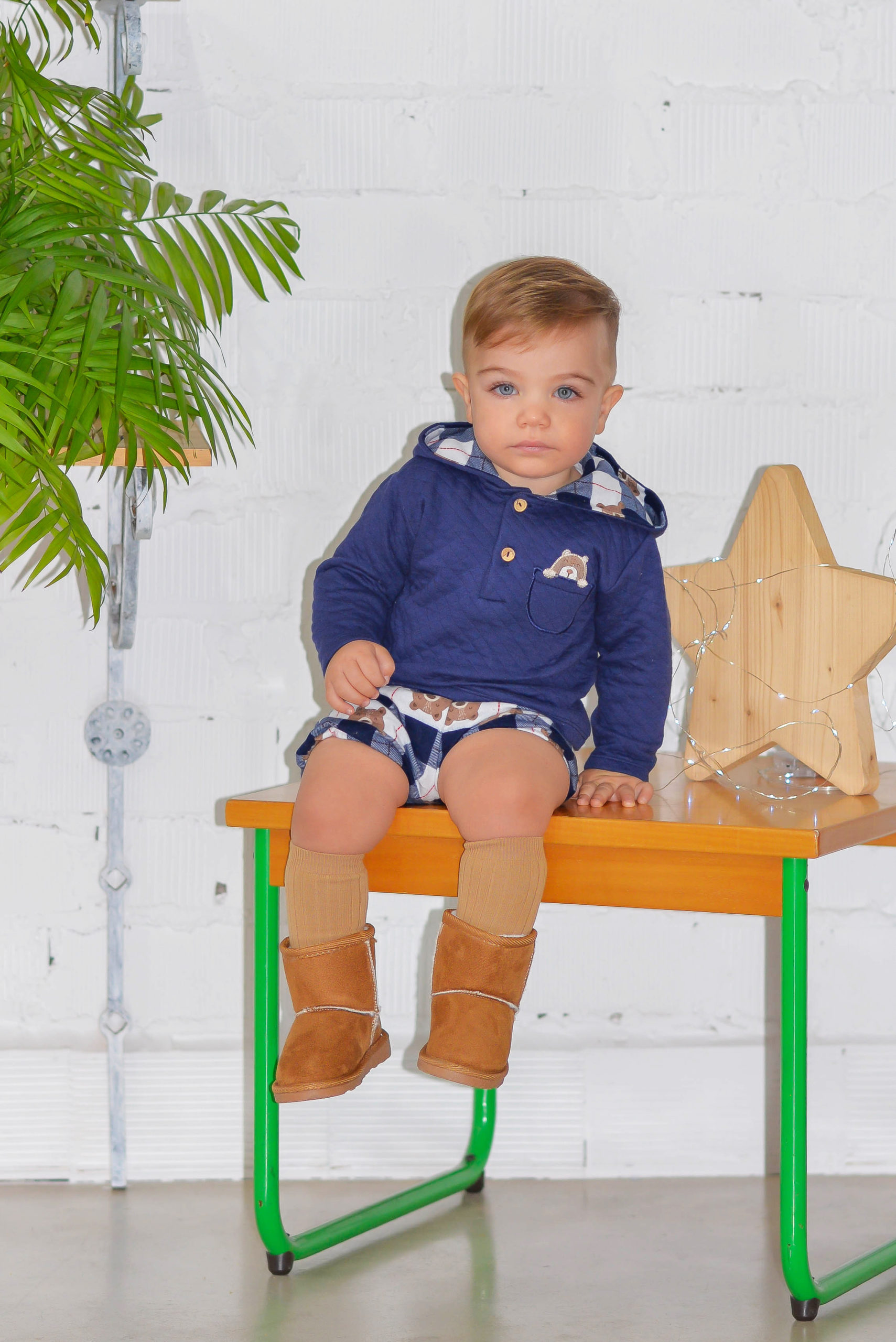 Conjunto formado por sudadera en color azul marino, con ilustración de un osito en la espalda, detalle de falso bolsillo en pecho con ilustración bordada de osito. Capucha con interior estampado de cuadros y ositos en tonos blanco, azul, marrón y rojo. Abertura delantera mediante dos botones. Pantalón corto con estampado de cuadros y ositos en tonos blanco, azul, marrón y rojo. Con cintura y piernas elásticas.