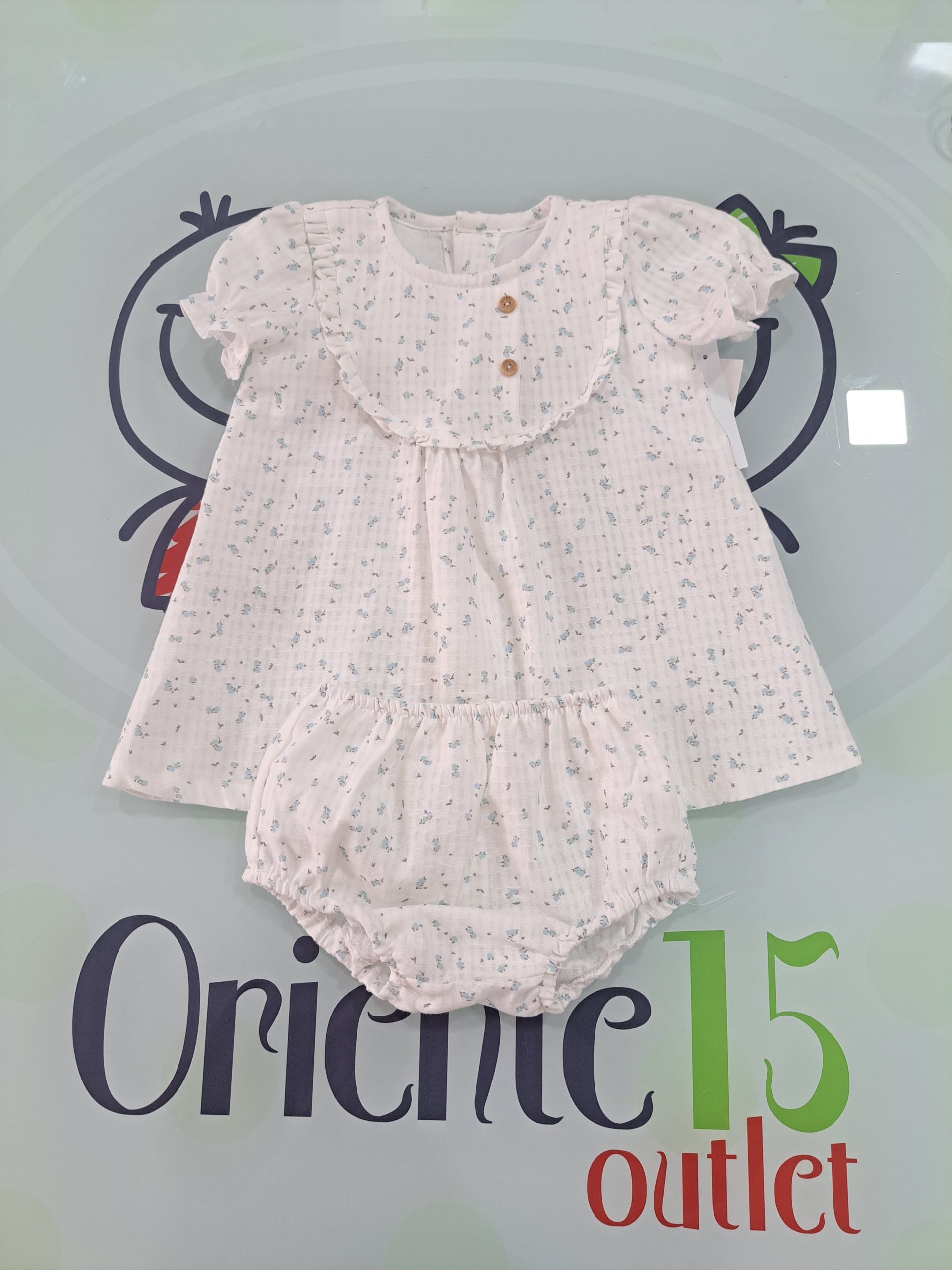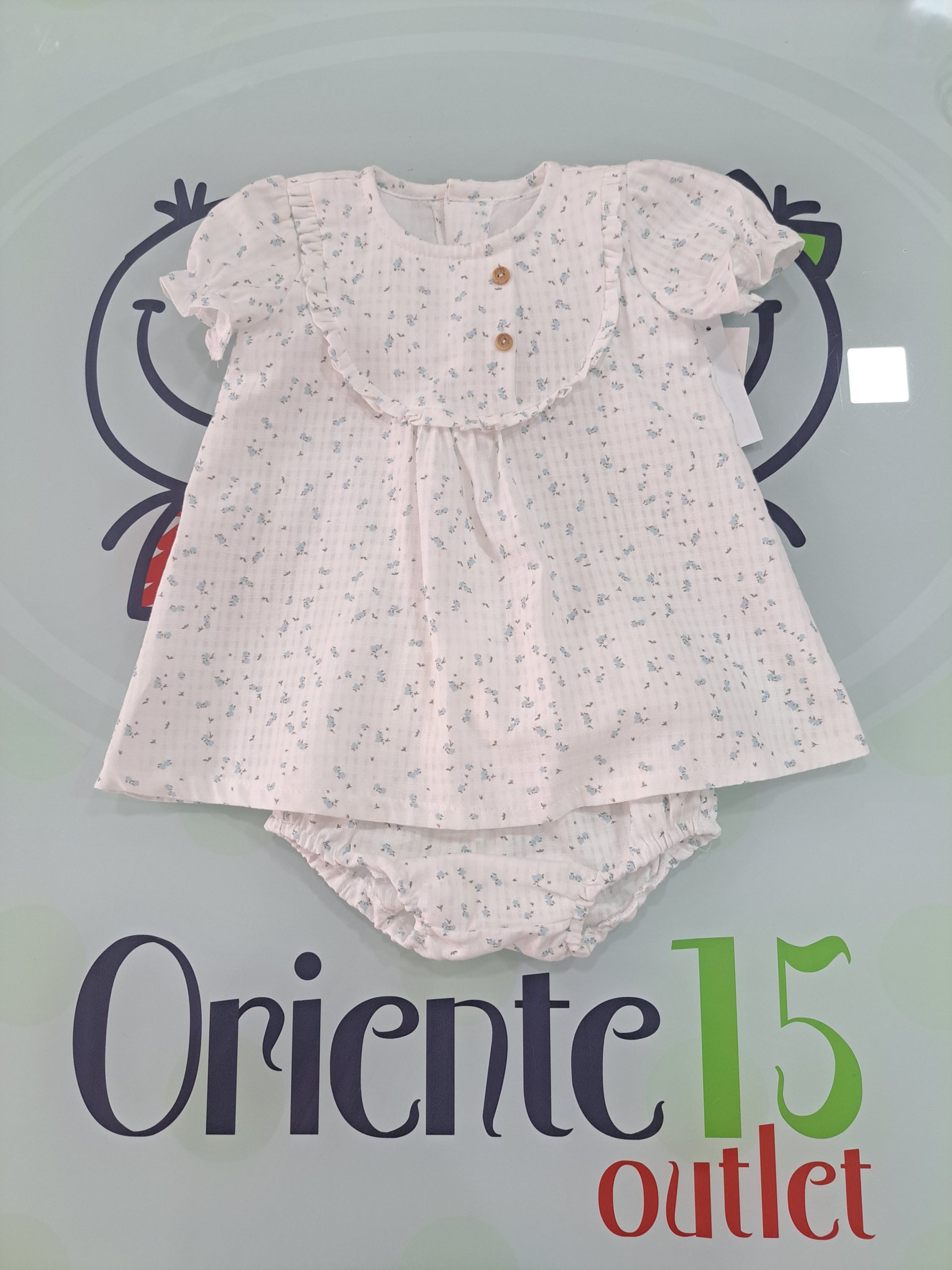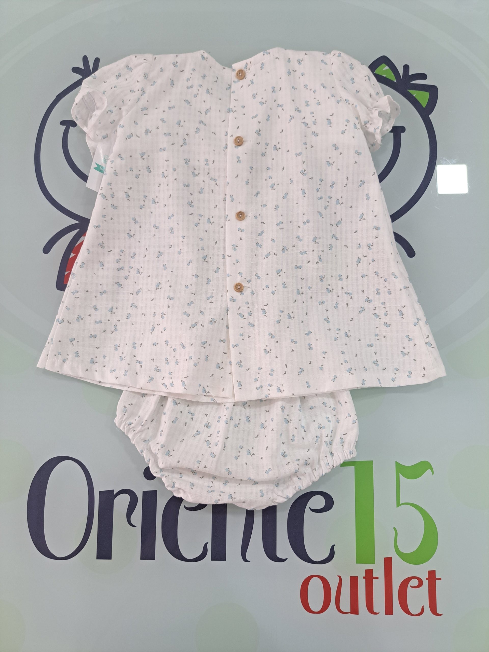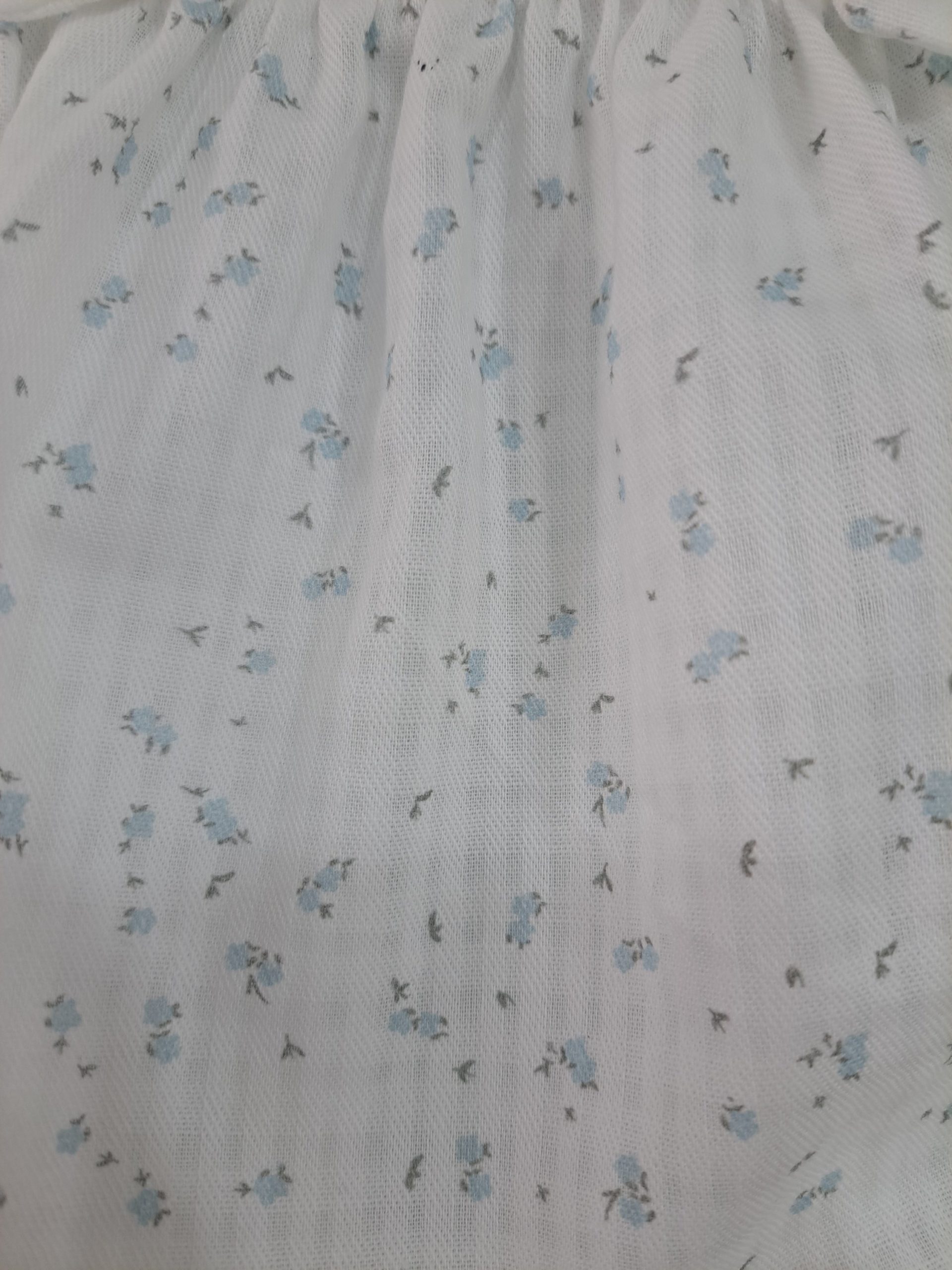 Jesusito de bambula en color blanco con estampado de flores color azul. Abertura en espalda con botones en color madera.