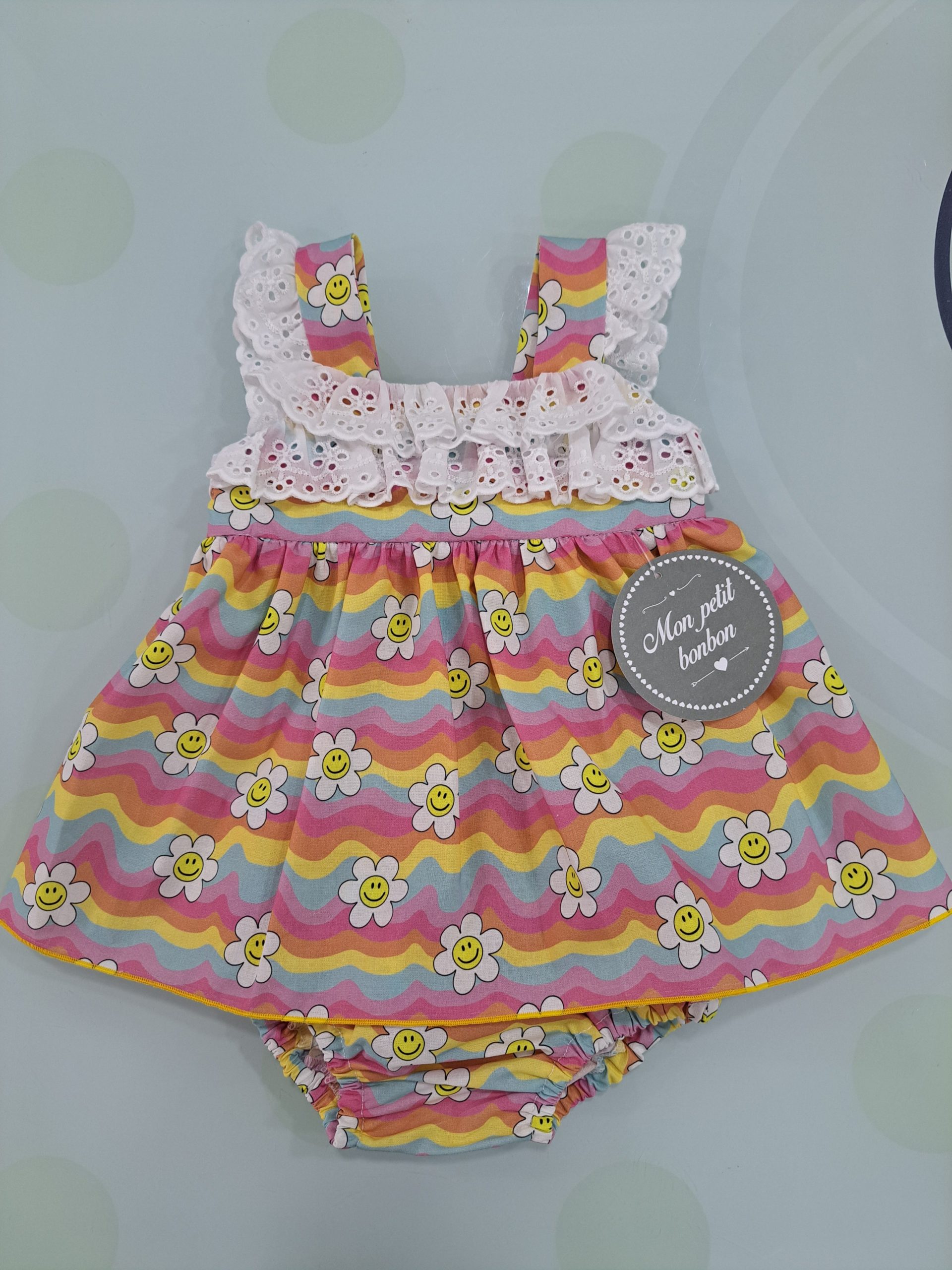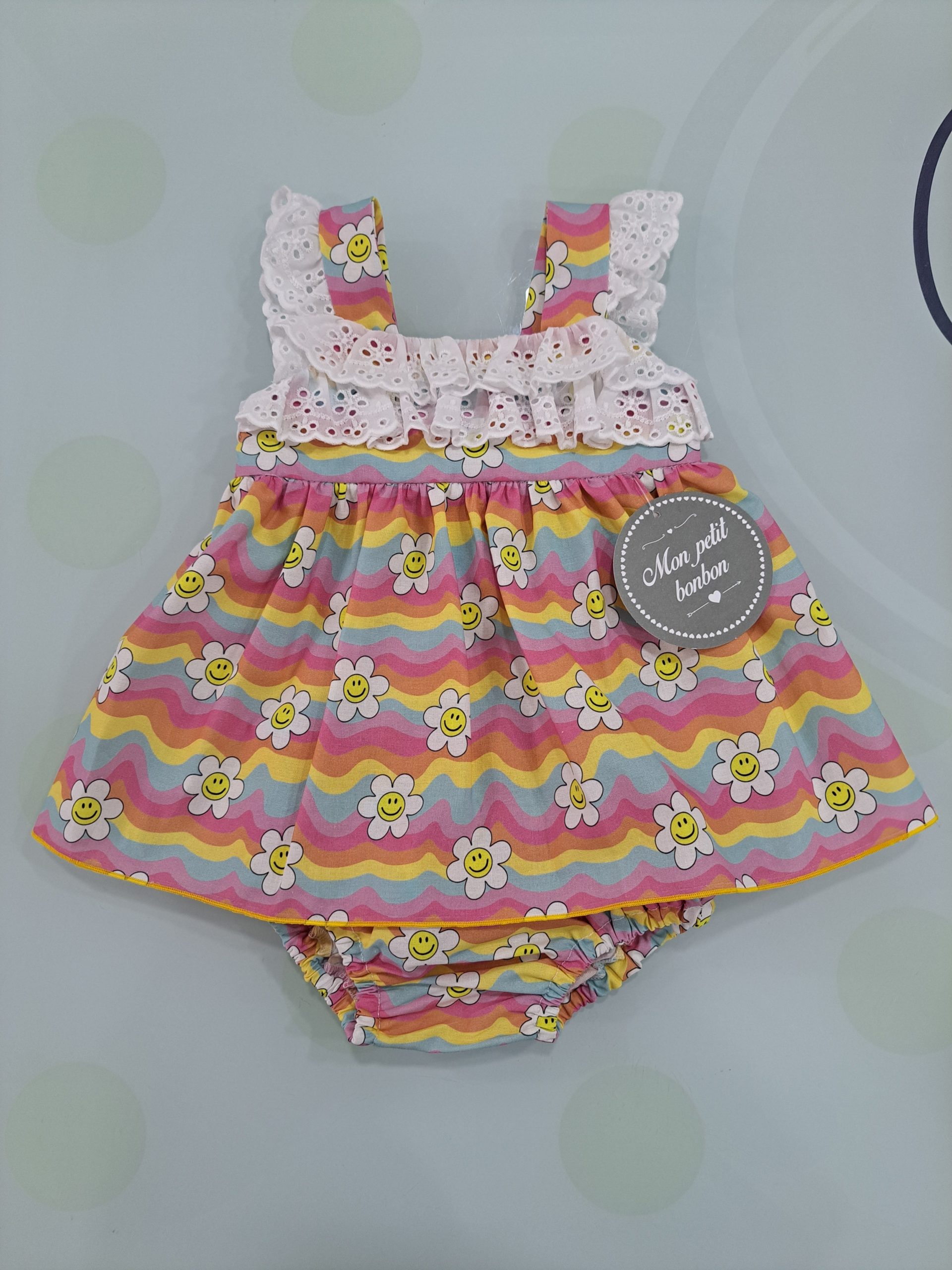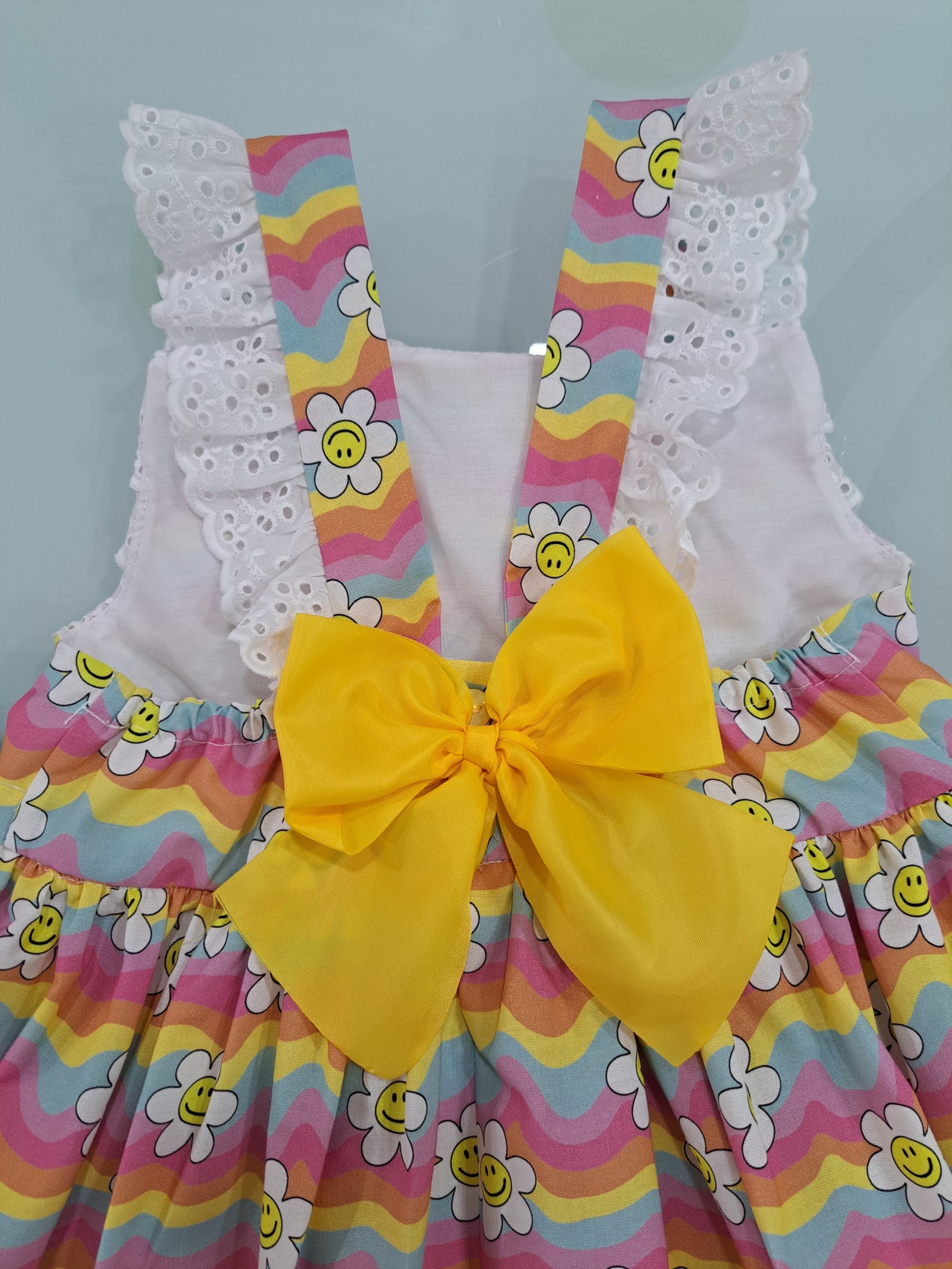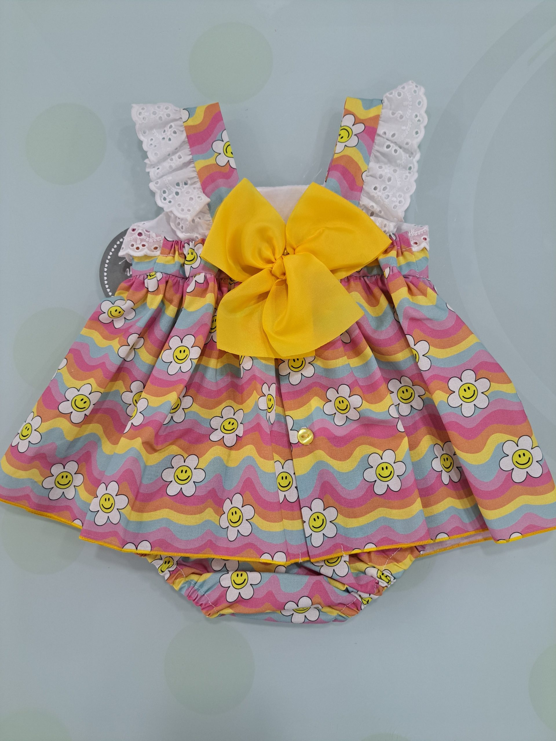Jesusito en estampado de rayas y margaritas en tono rosa, amarillo y azul cielo. Tirantes y pecho con volantes con flores troqueladas en color blanco. Abertura en espalda con dos botones y lazo color amarillo.