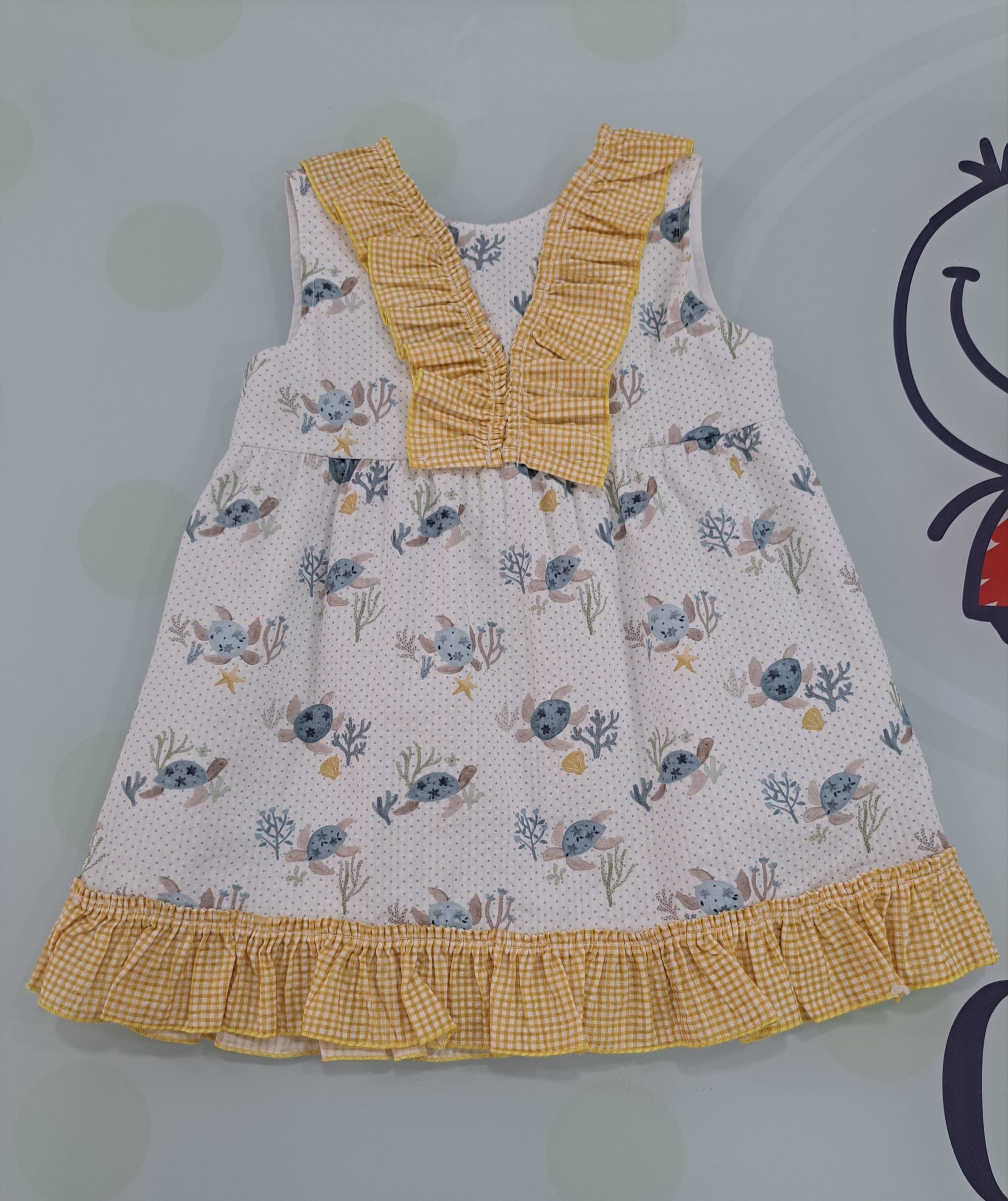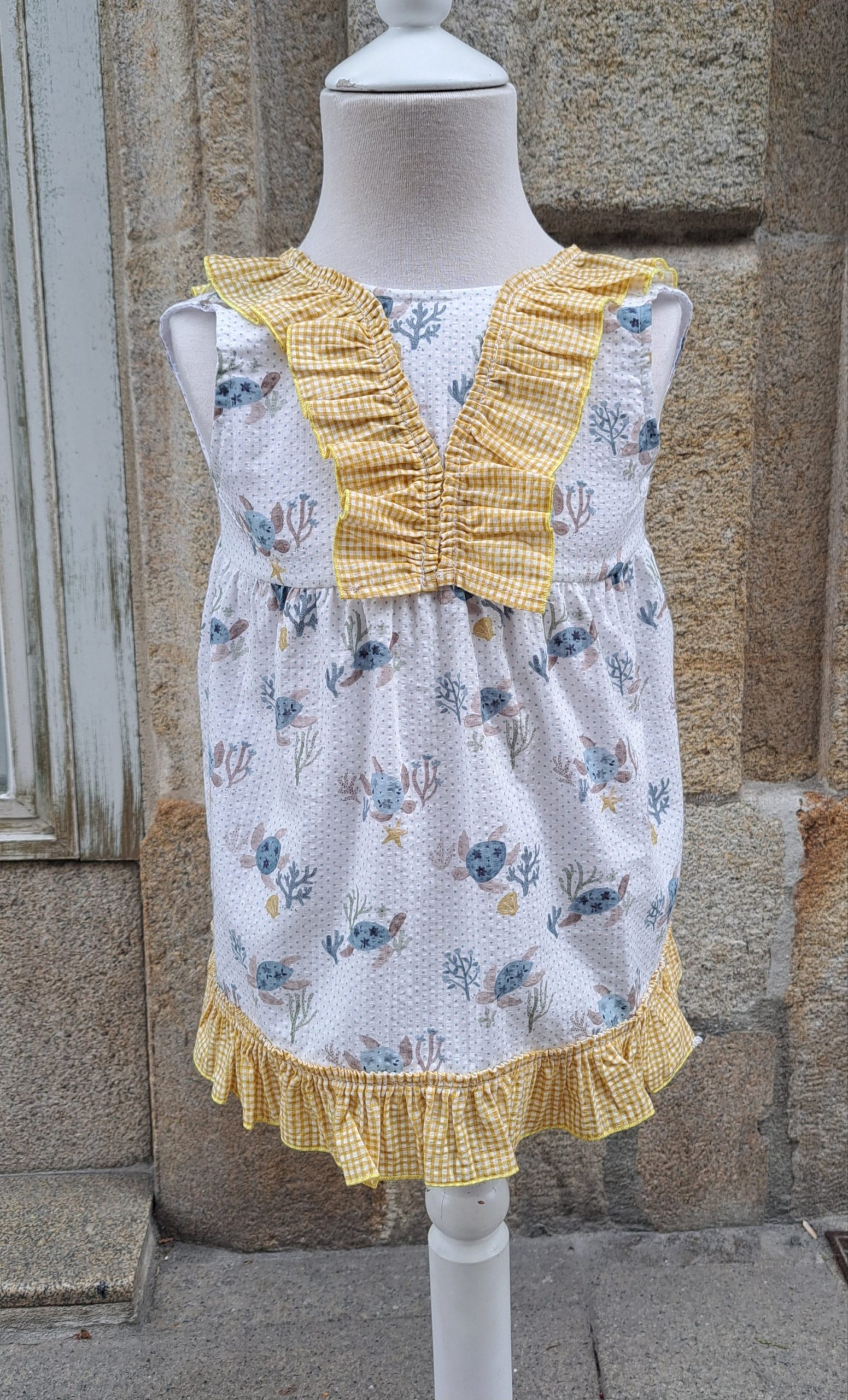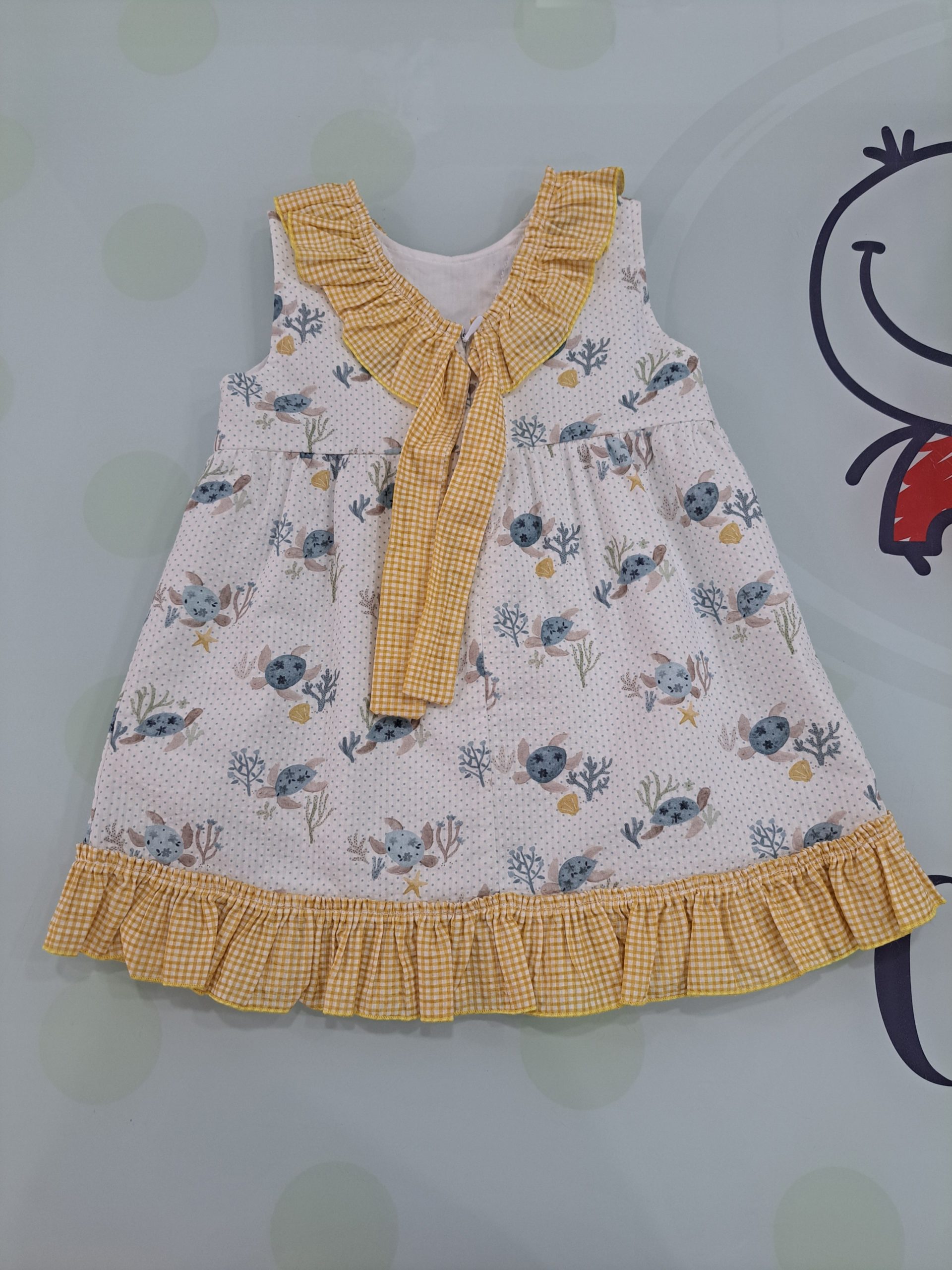 Vestido color blanco en estampado de tortugas y topitos en color azul. Ribeteado en pico desde pecho hasta espalda en estampado vichy en tonos blanco y amarillo. Bajos de volantes en mismo estampado vichy.