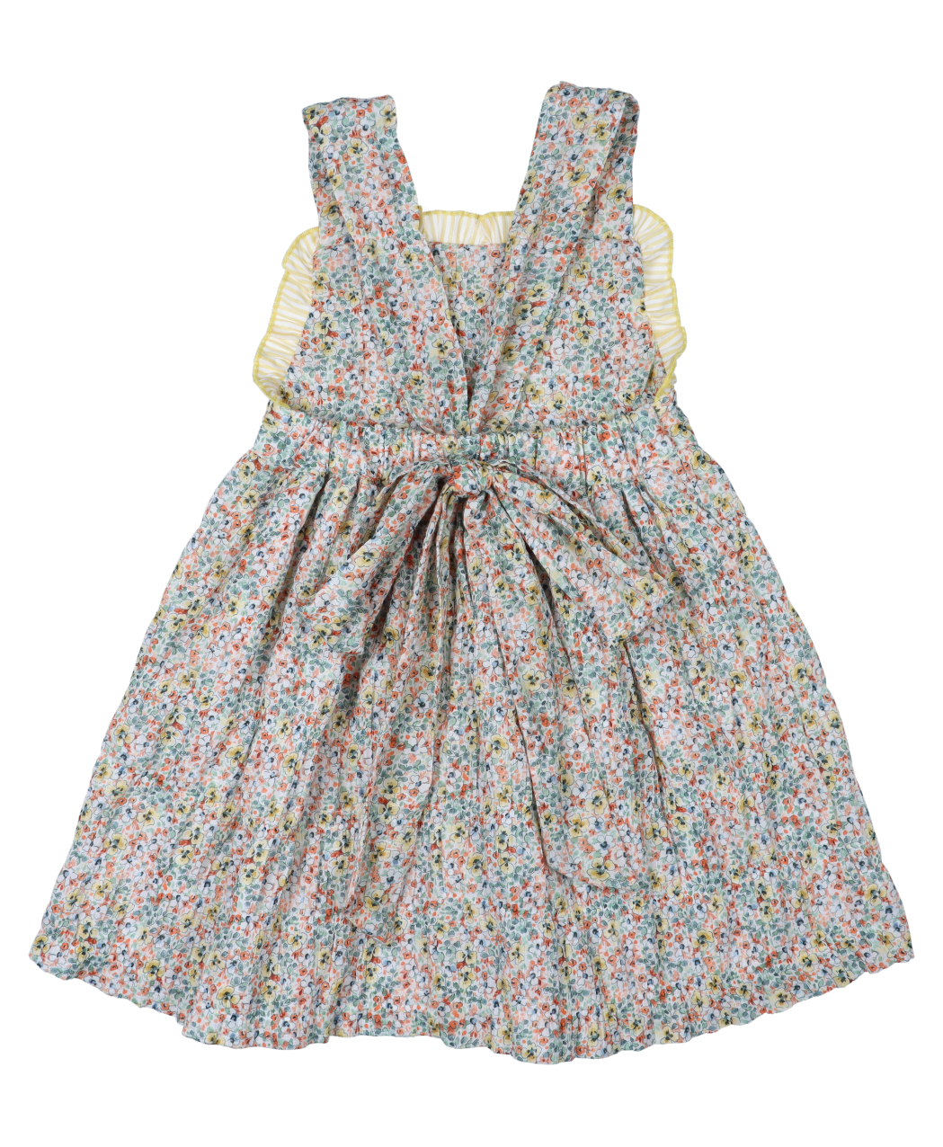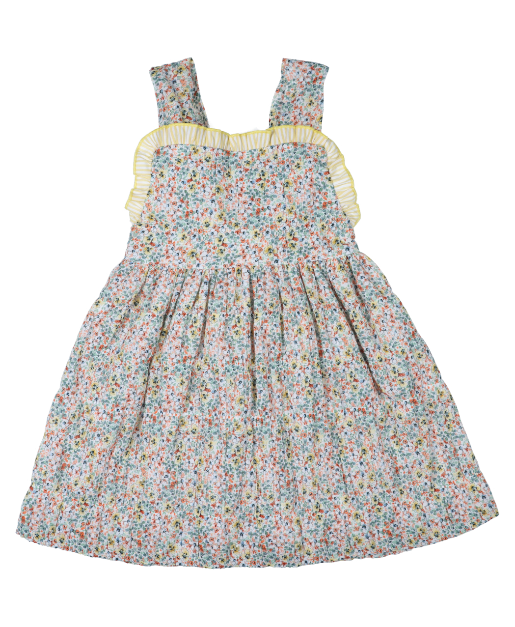 Vestido floral multicolor, con bordado de rayas en tonos blanco y amarillo, fruncido efecto nido de abeja, tirantes ajustables con lazo y espalda abierta. 100% algodón.