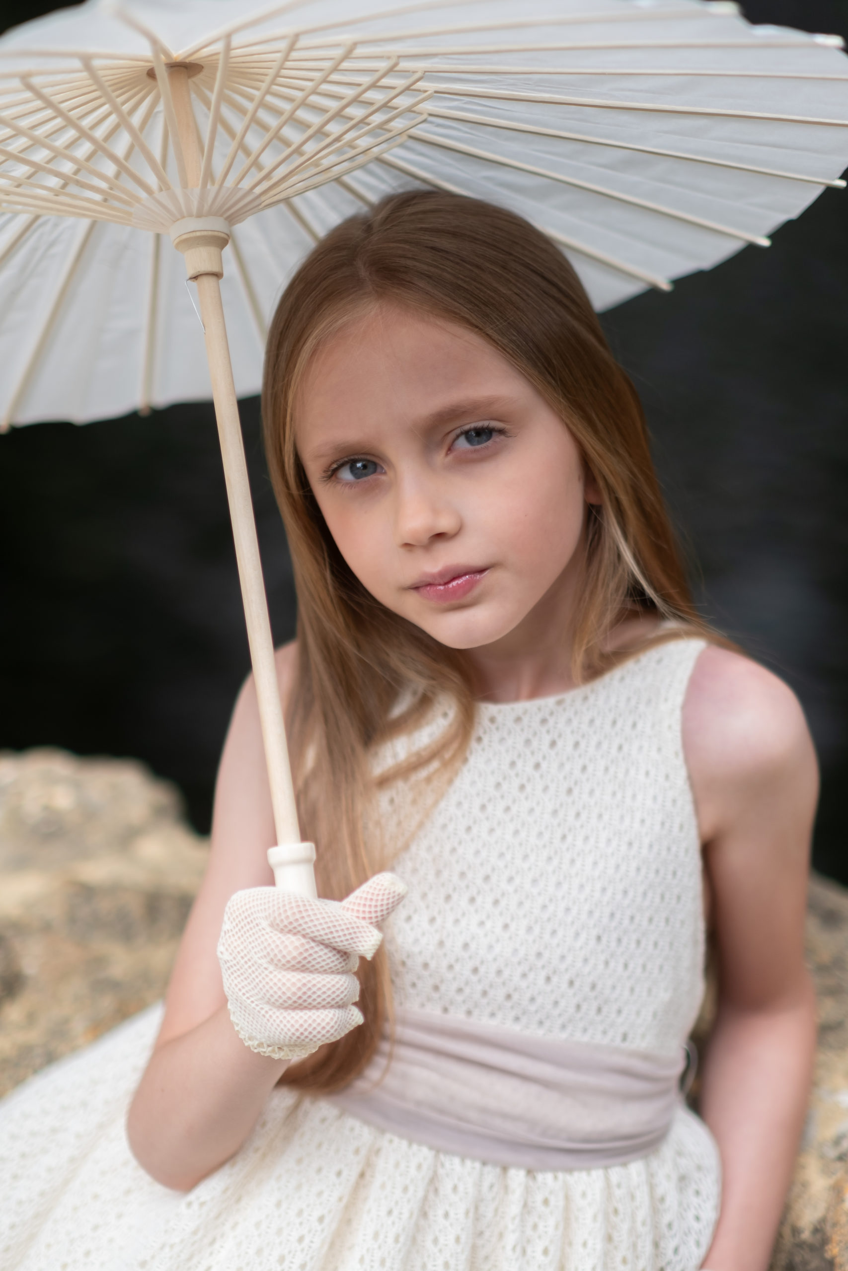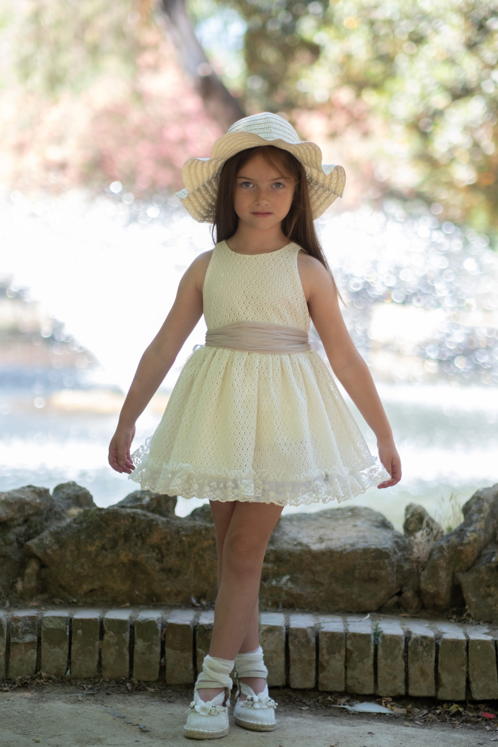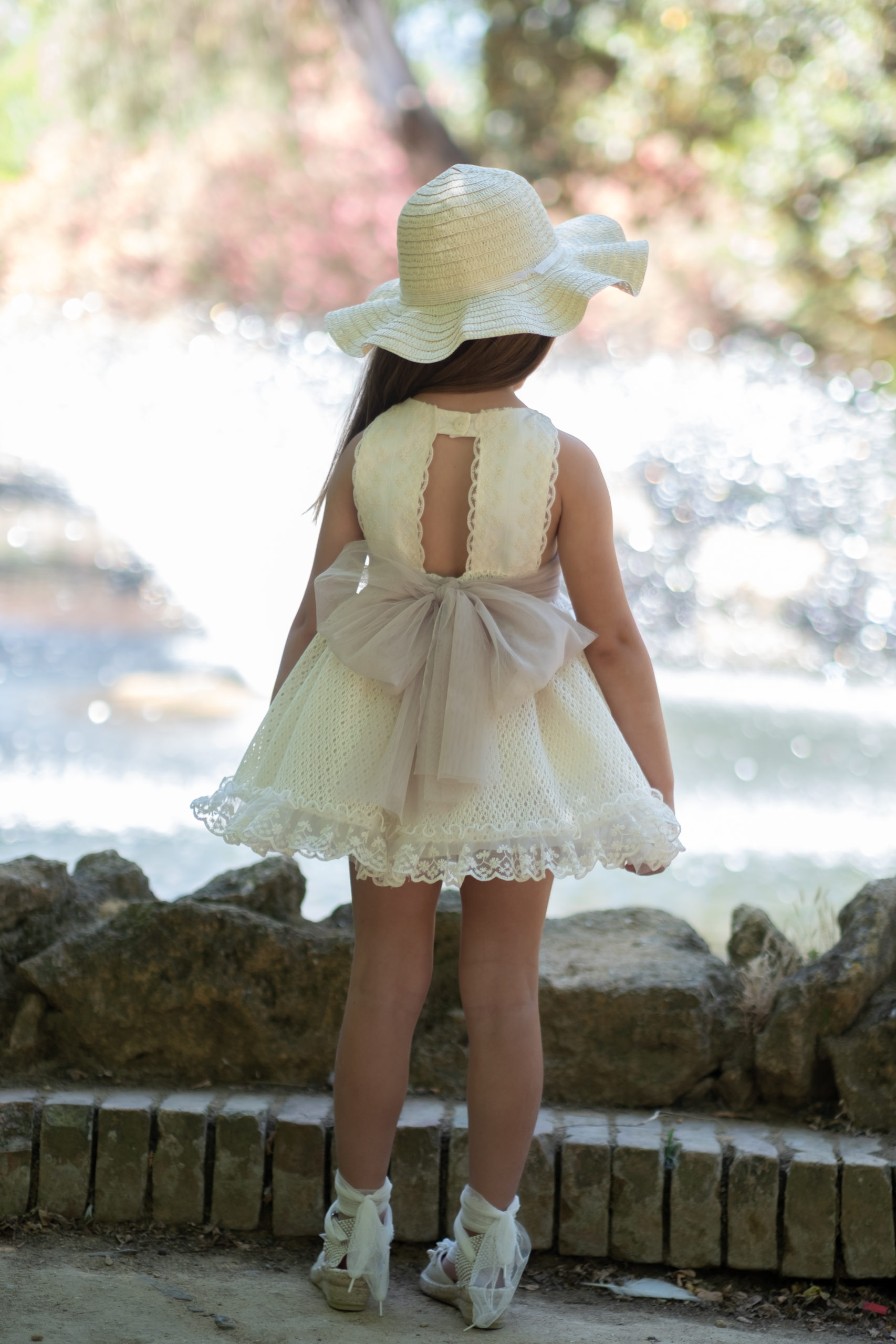 Vestido calado en tono marfil, lazo de tul en mismo tono o a elegir, espalda media abierta, tirantes en espalda con encaje, abertura con botón por detrás del cuello y cremallera en la zona baja de la espalda, bajos con en mismo encaje. Los colores del lazo de tul se pueden elegir en los siguientes colores: azul, rosa palo, beige, marrón, verde agua, camel, celeste, marfil, rosa empolvado y verde.