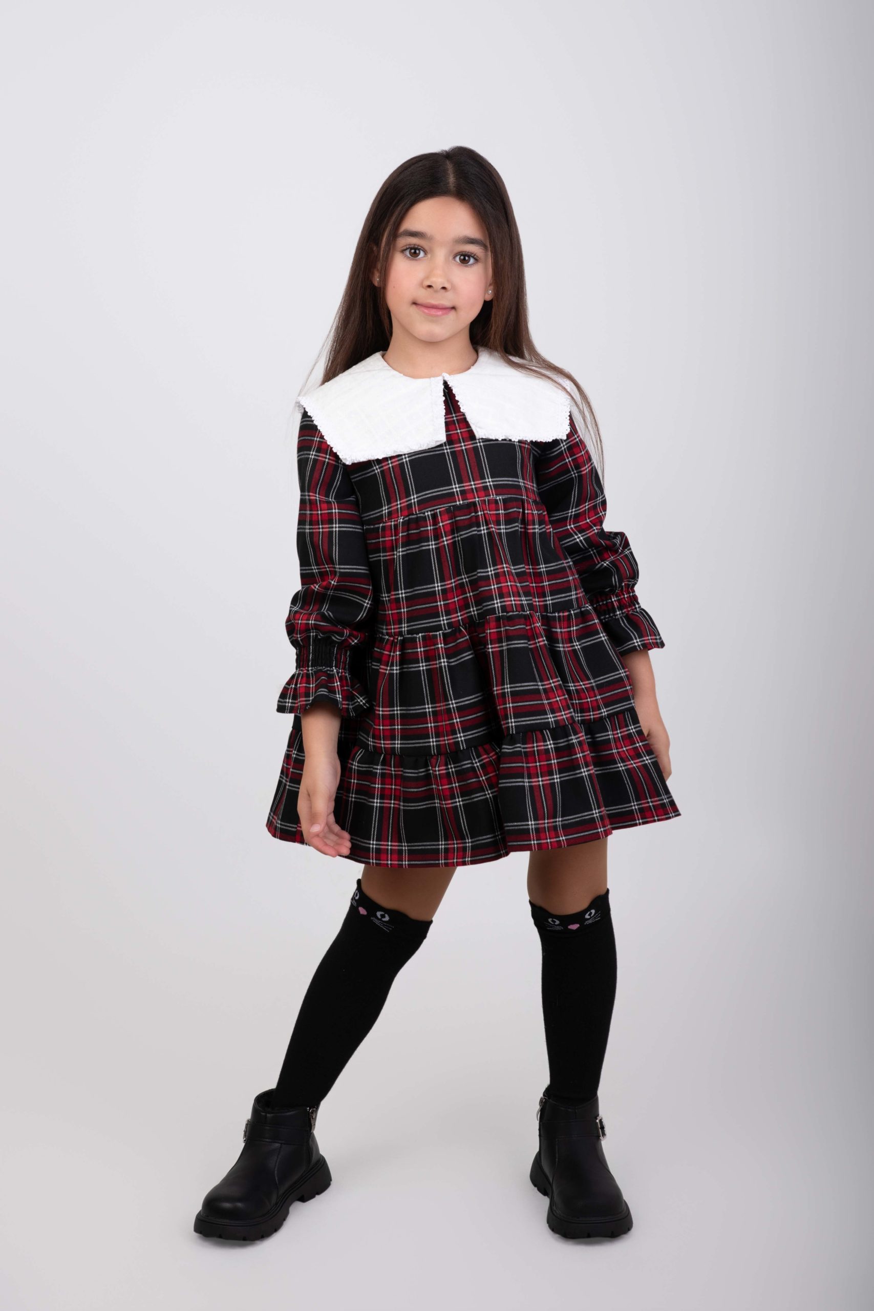 Vestido de color negro con estampado de cuadros tartán en tonos rojo y blanco. Con volantes, mangas elásticas. Forro interior. Cuello Peter pan en color blanco con estampado de cuadros y plumeti en tonos blanco, detalles bordado. Abertura trasera por cremallera.