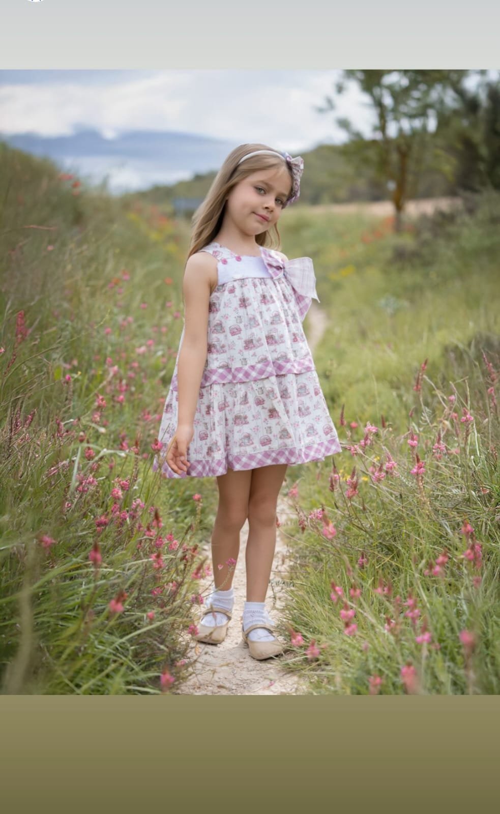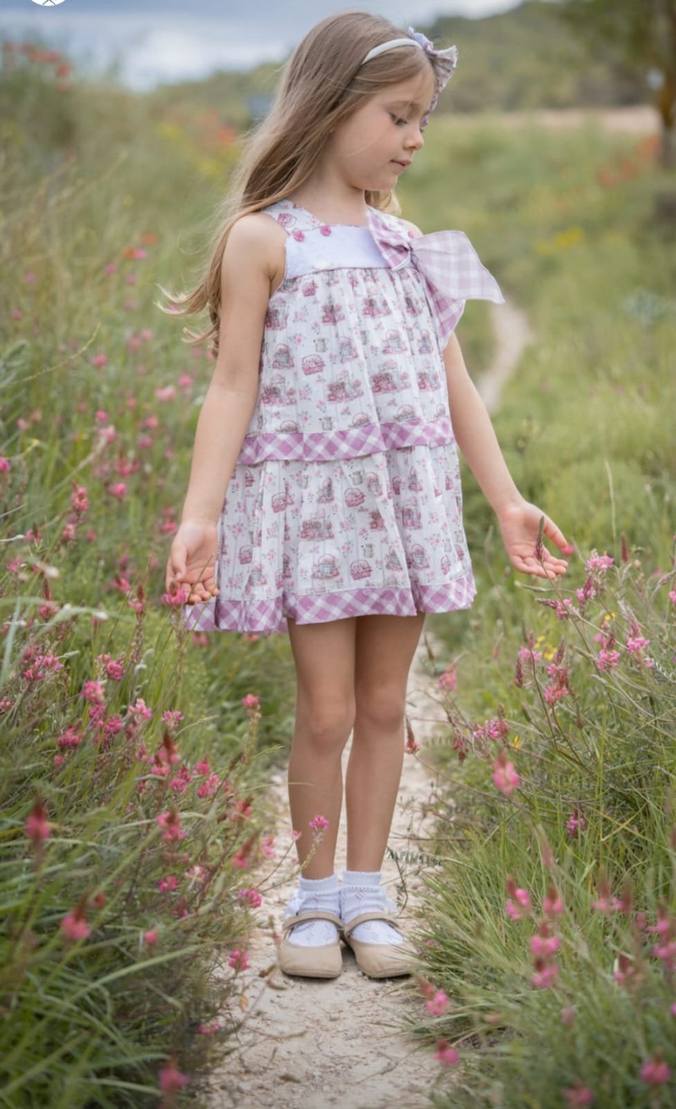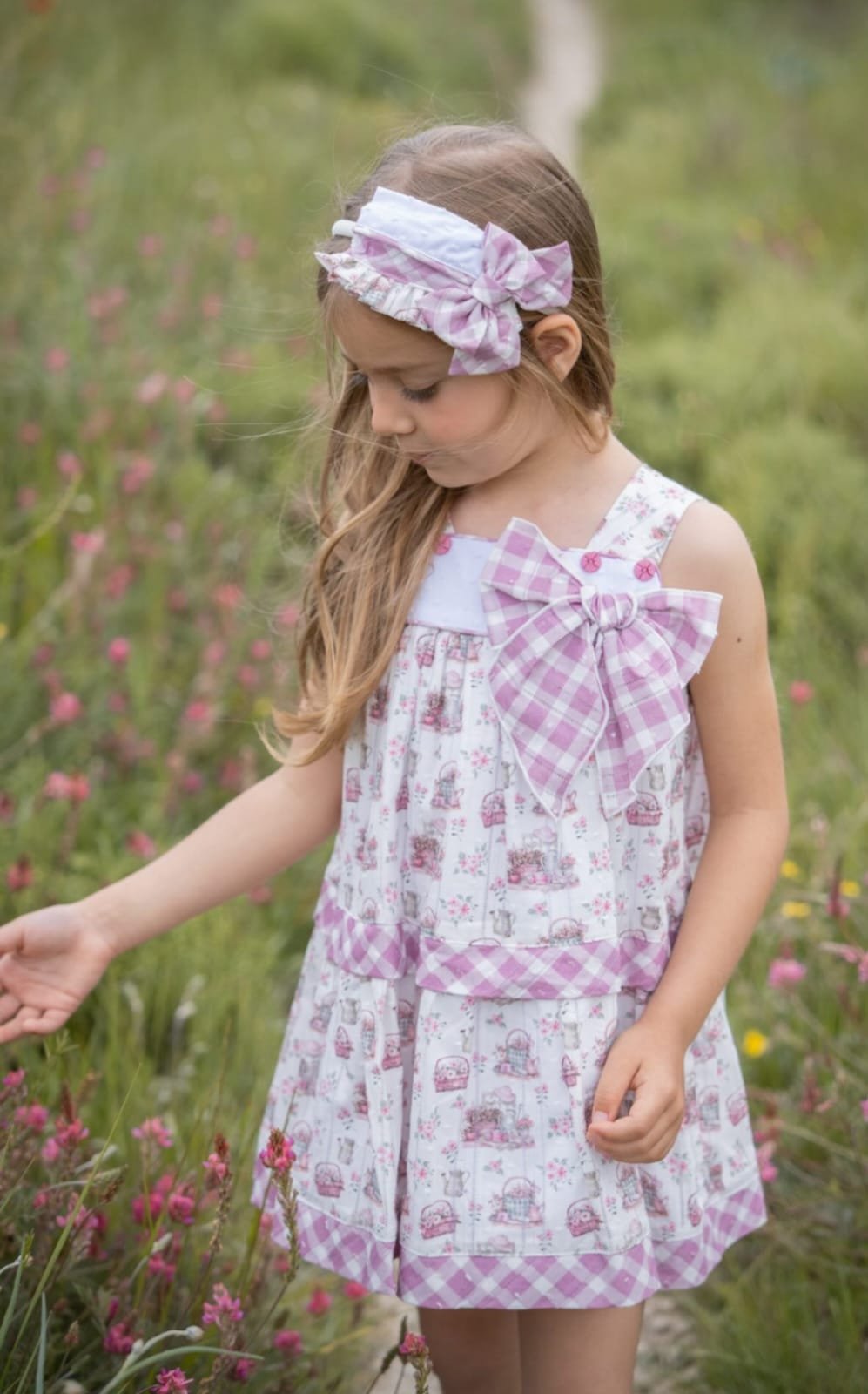 vestido en estampado de macetas combinado con vichy en tono rosa y blanco, volantes y lazo en pecho.
