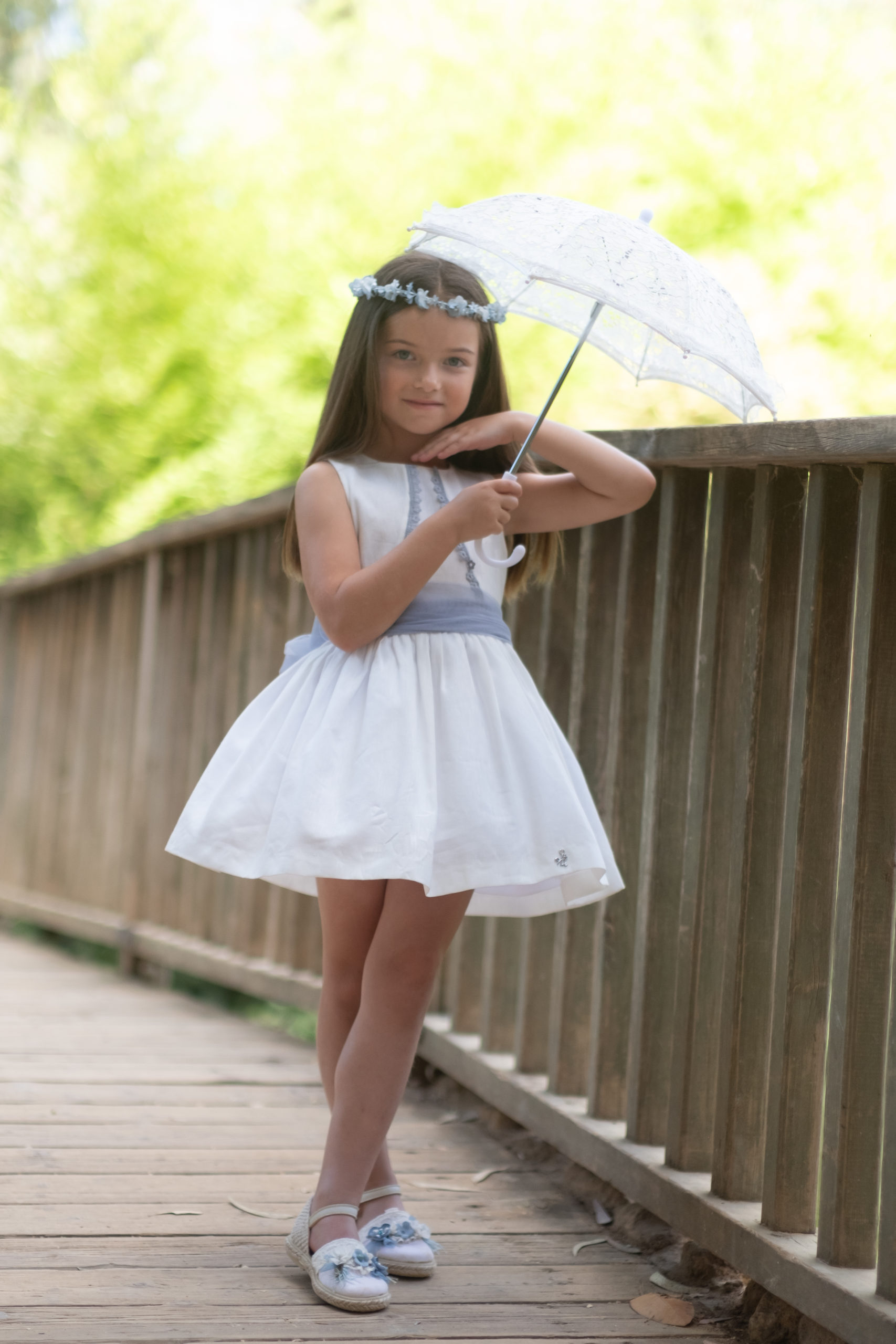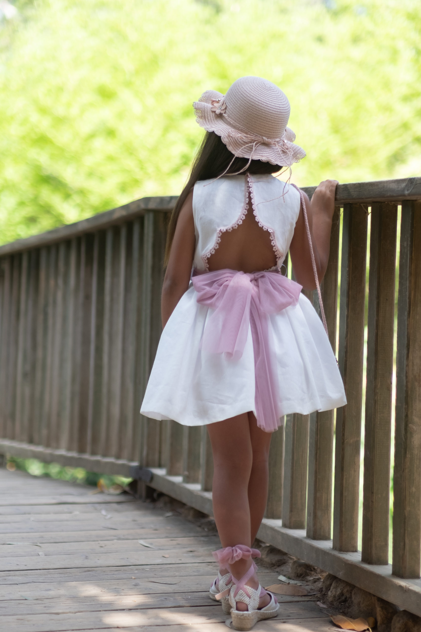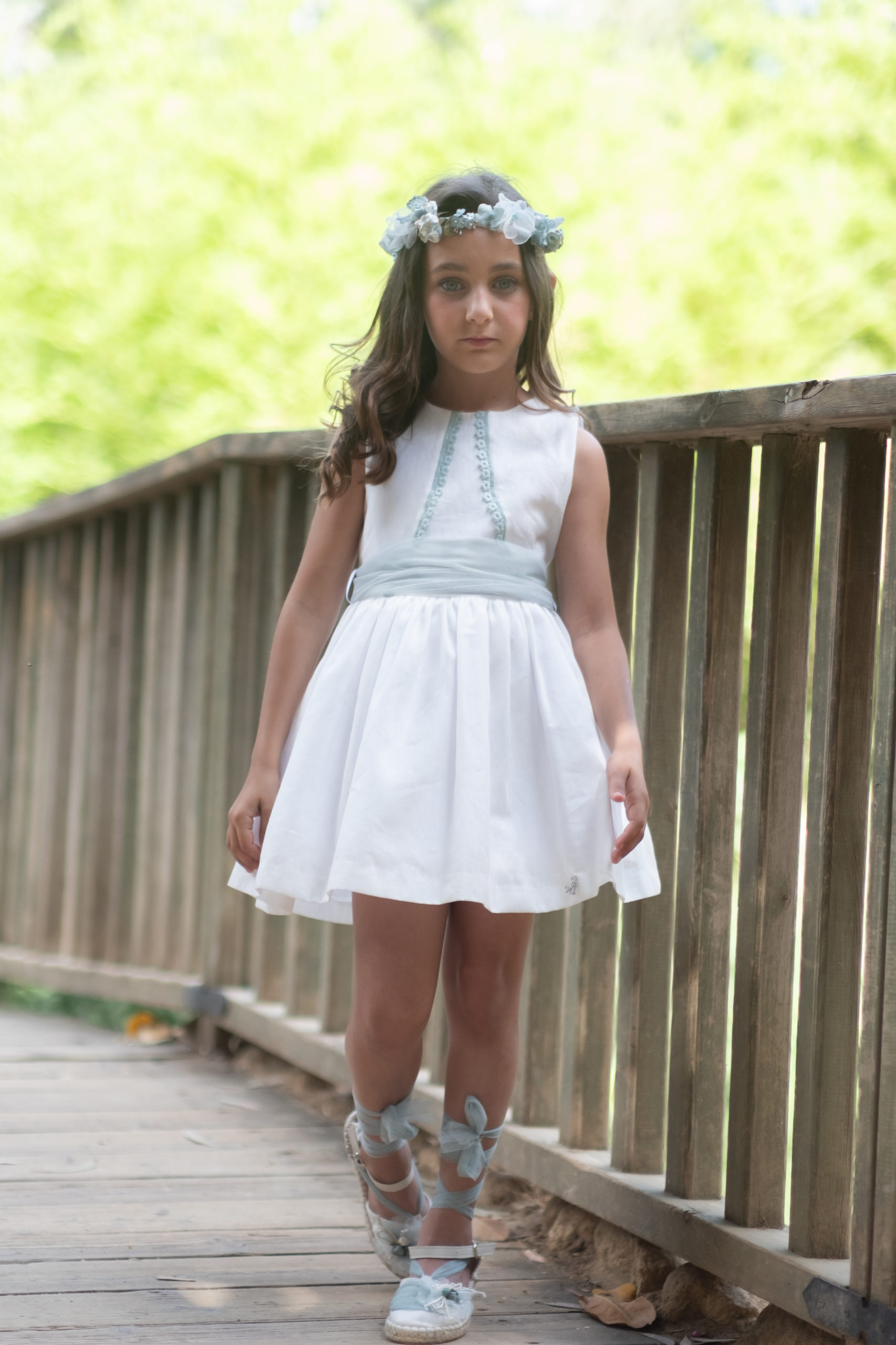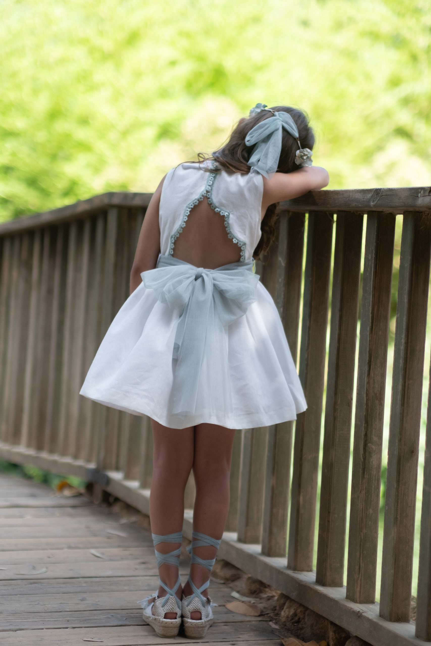 Vestido blanco, con lazada en cintura y lazo de tul en espalda. Bordado de flores en pecho en color rosa empolvado / azul o verde. Espalda abierta con mismo bordado de flores. Ideal para ceremonia.