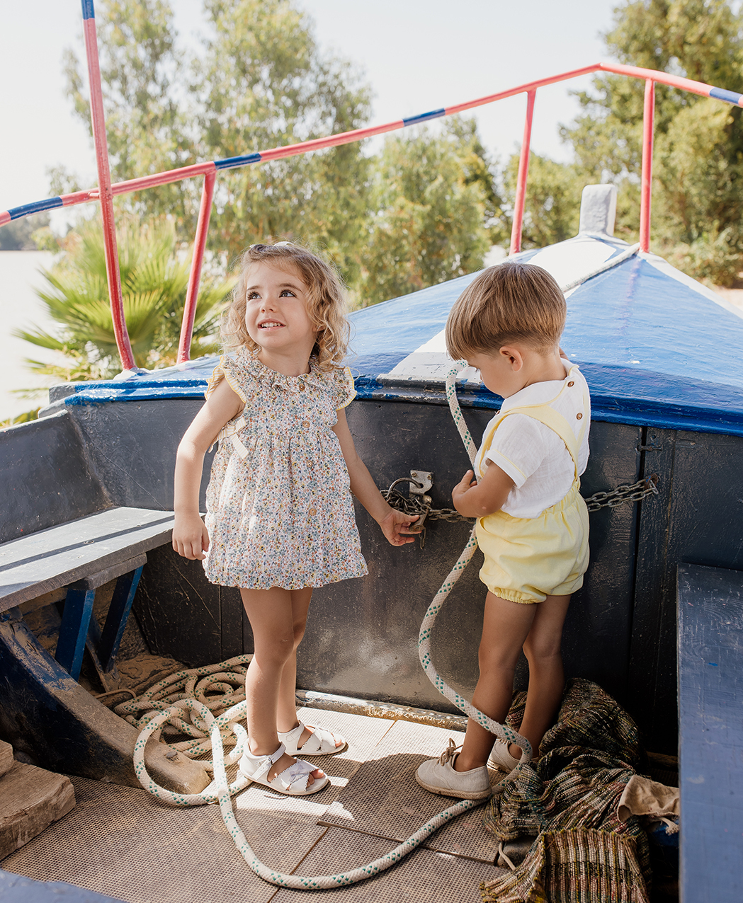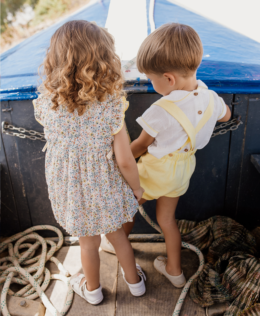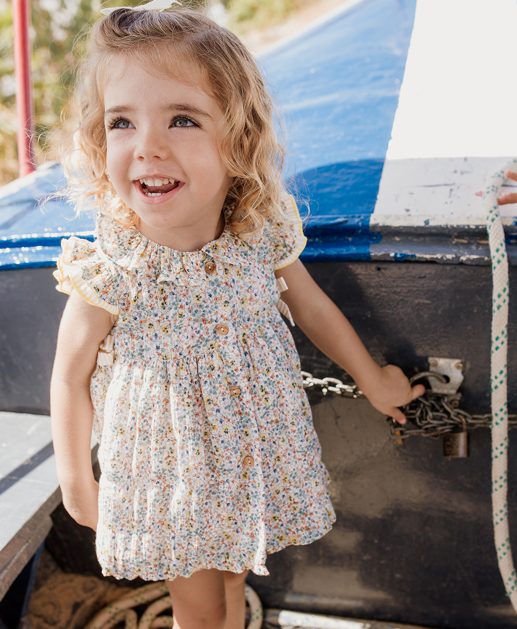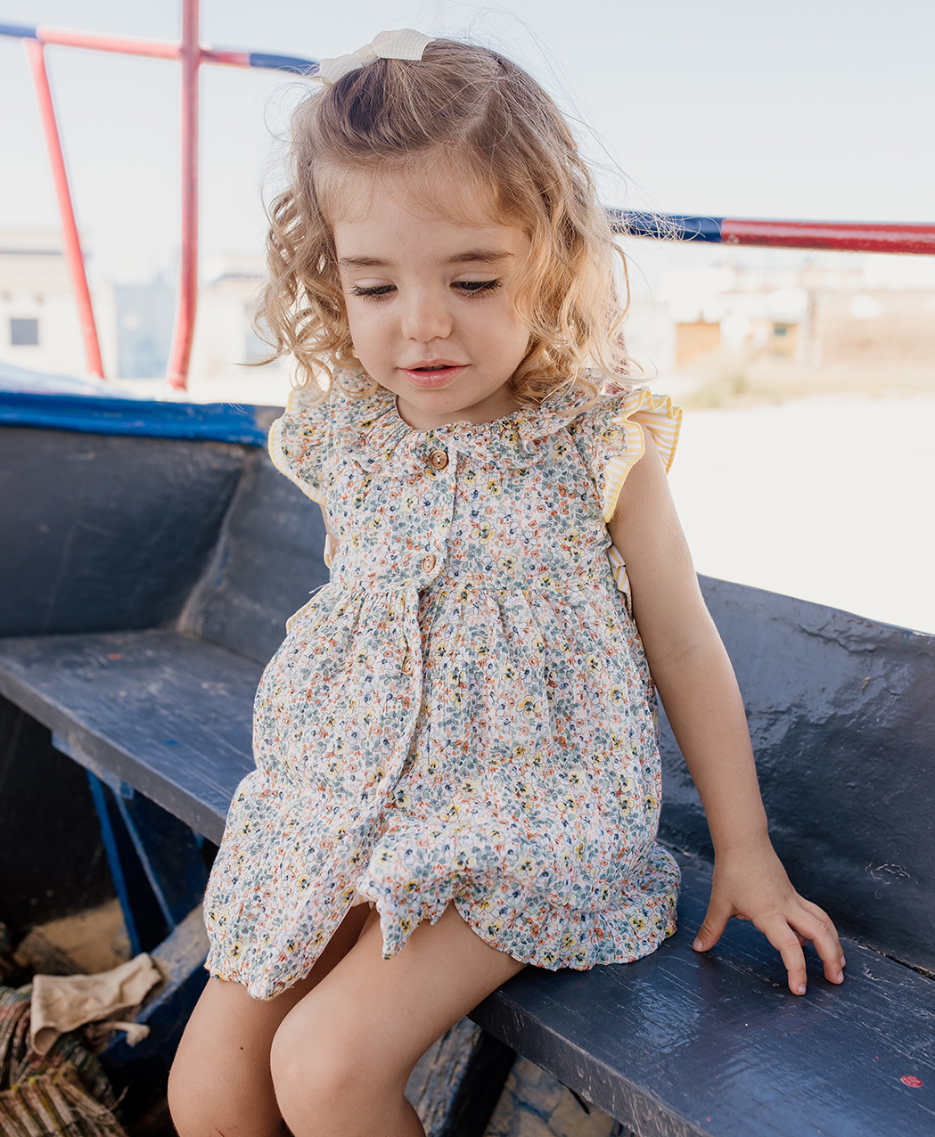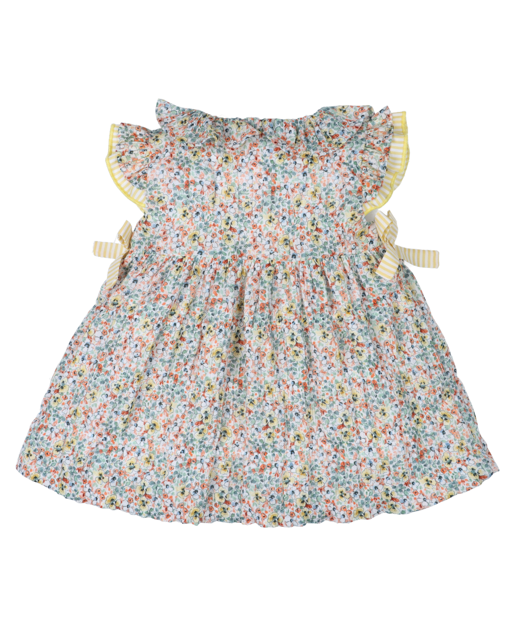 Vestido floral multicolor, cuello bebé, fruncido efecto nido de abeja y hombros con volantes de rayas en tonos blanco y amarillo. Abertura por delante con botones efecto madera y lazos laterales de rayas en tonos blanco y amarillo. 100% algodón.