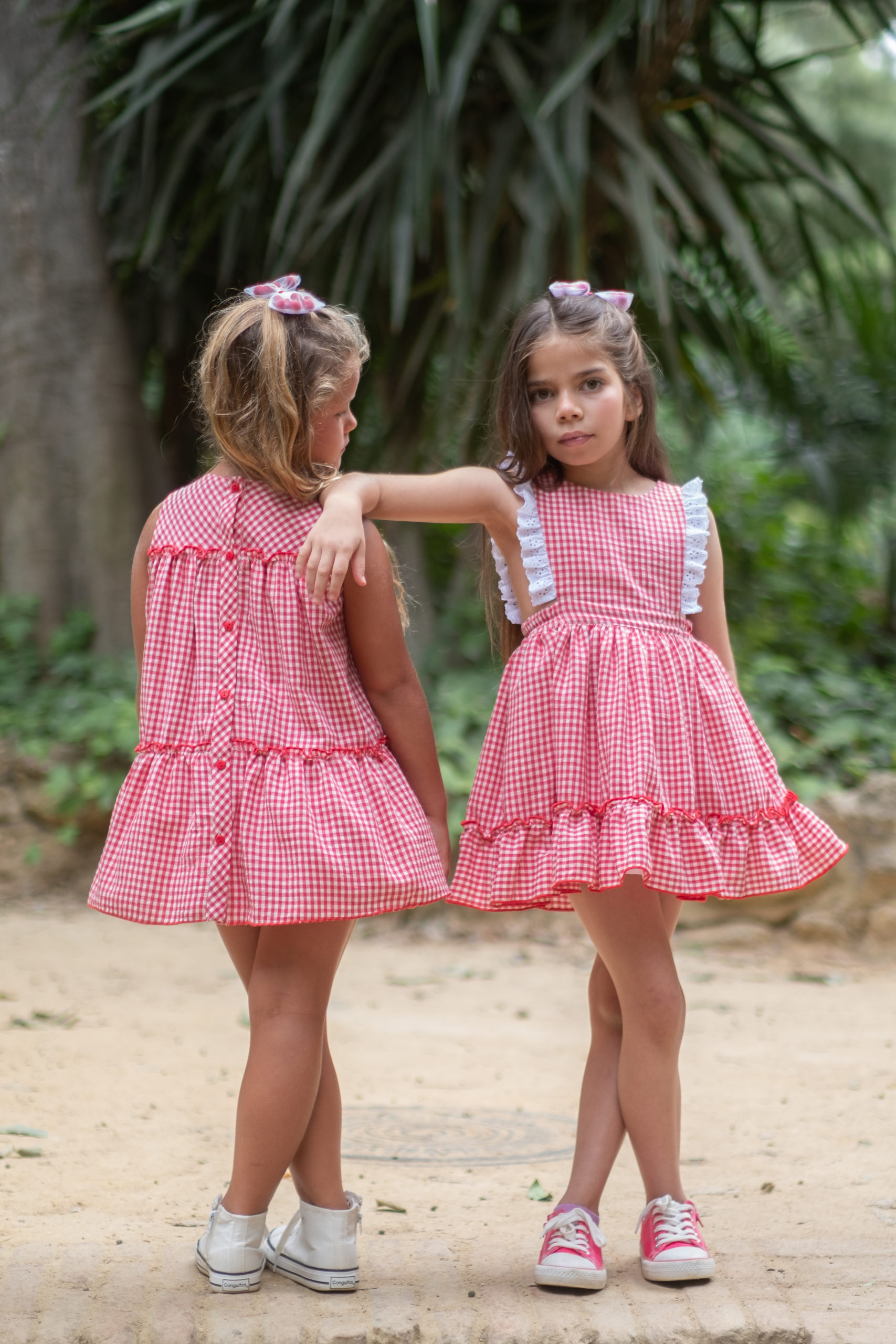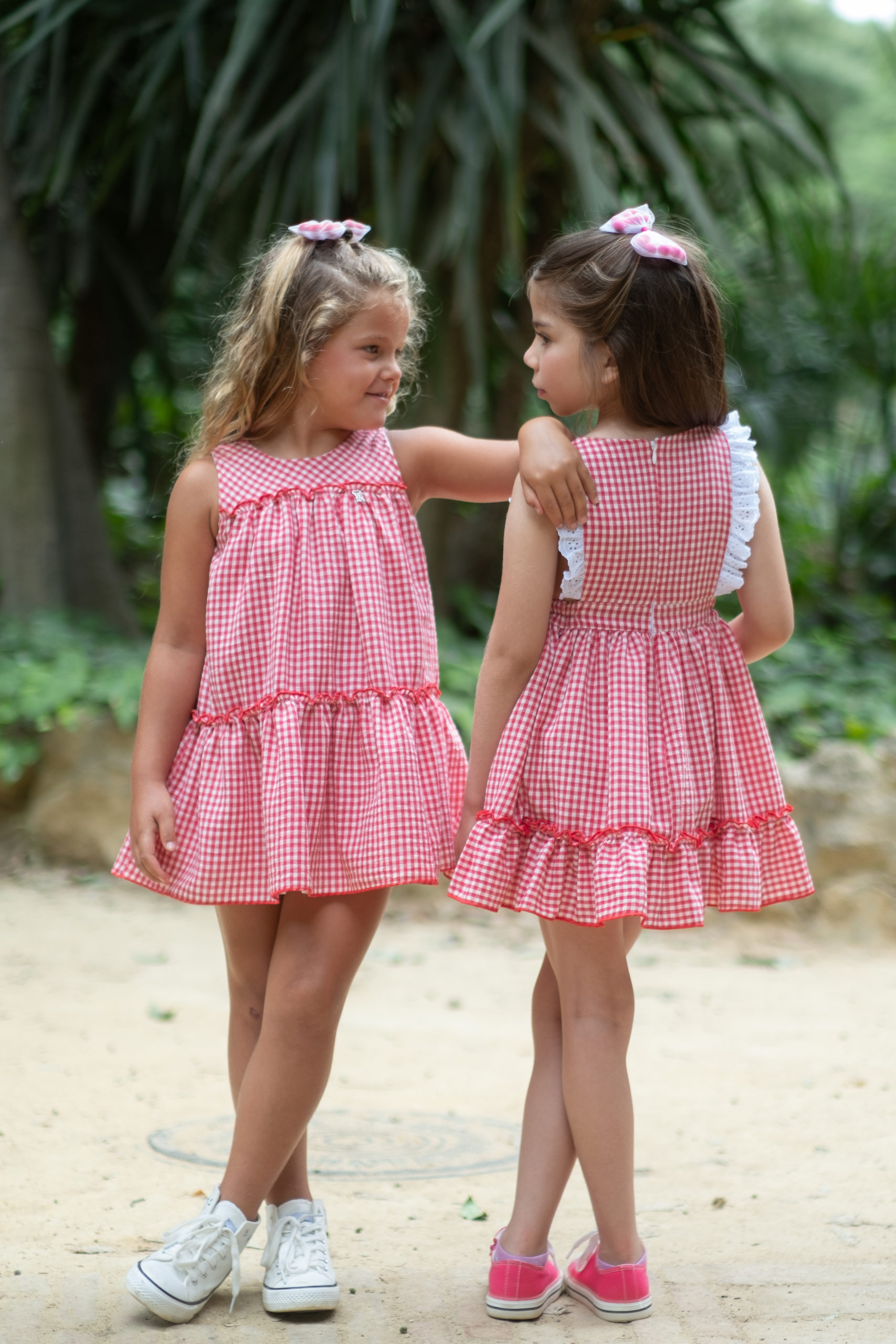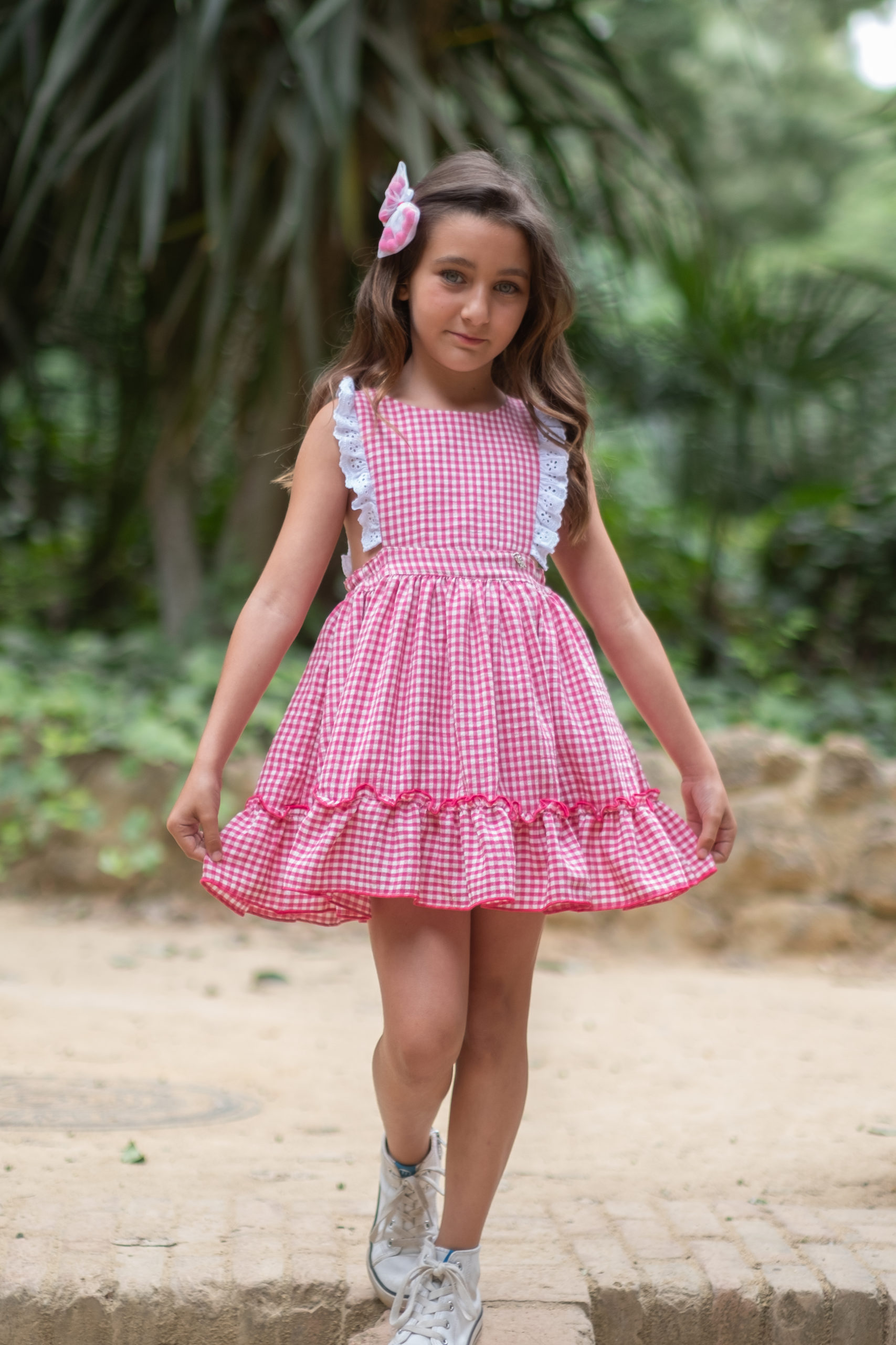 Vestido estilo pichi, en estampado vichy color fucsia y blanco, bordado de flores en tirantes color blanco, volantes en parte baja y cierre en espalda con cremallera.