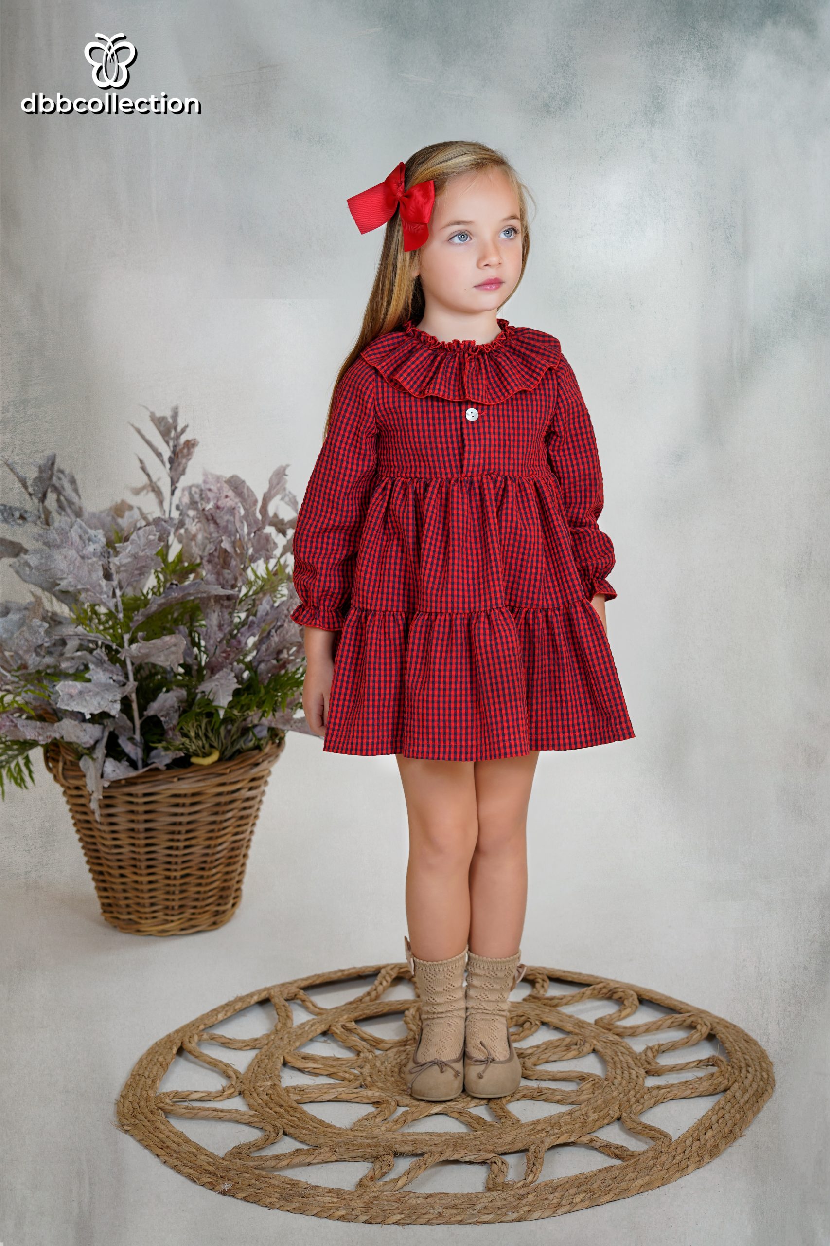 Vestido en cuadro vichy color rojo y azul marino, cuello volante, abertura en pecho con botón y elástico en manga.