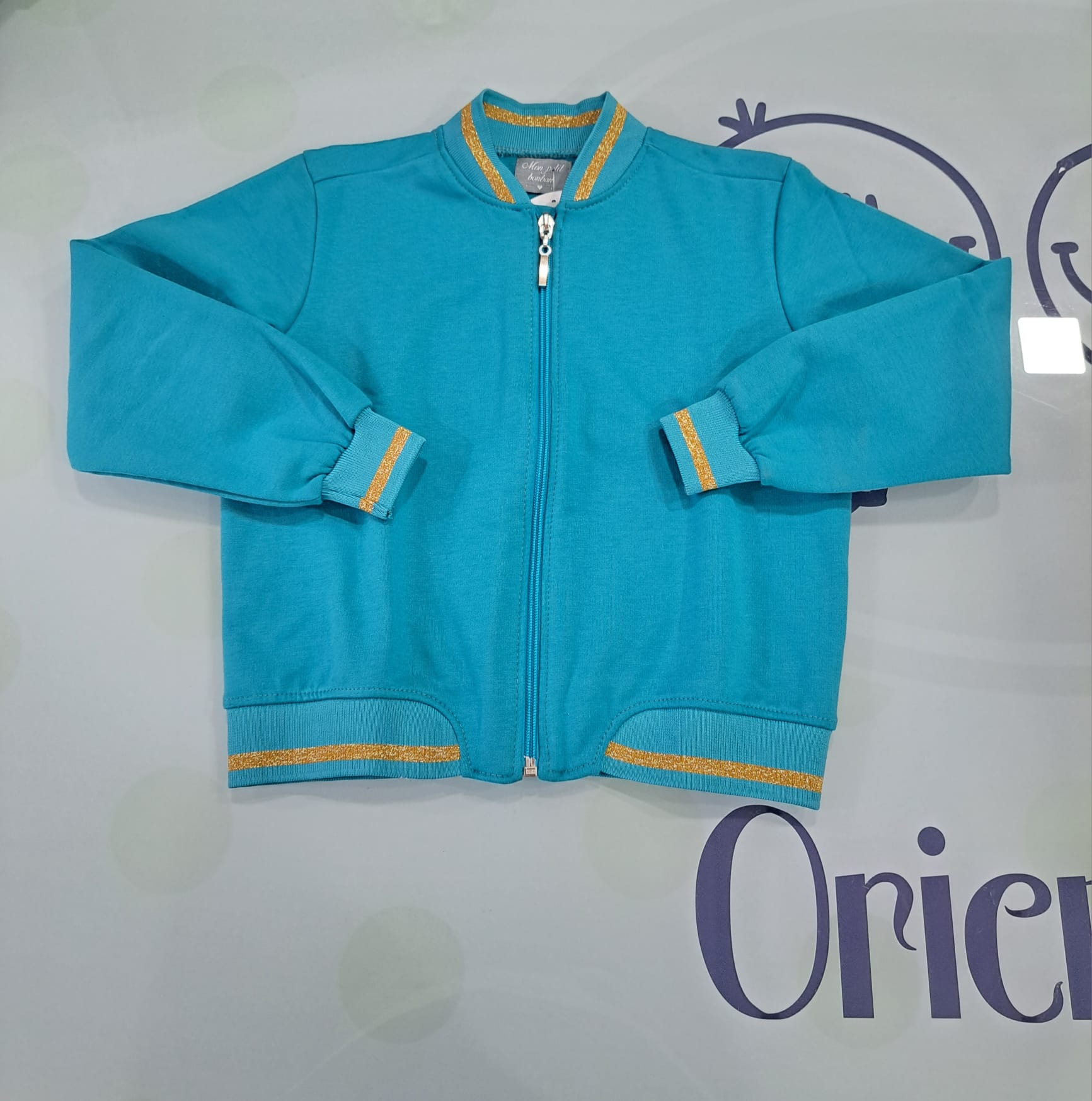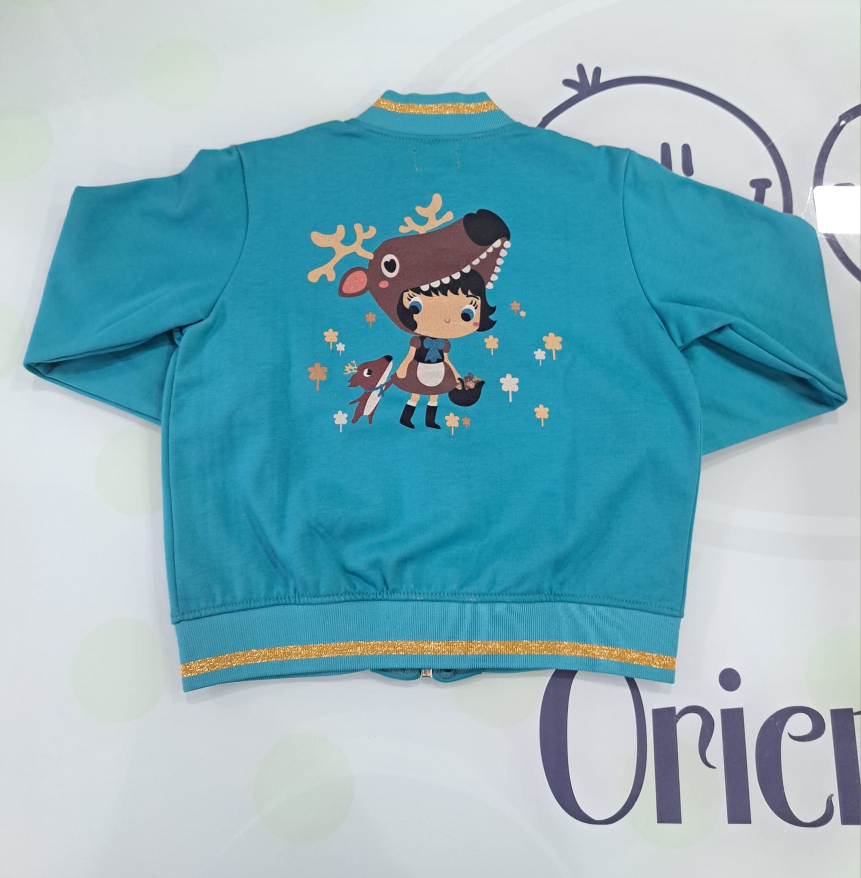 Bomber color turquesa, abertura delantera con cremallera, puño y bajo elástico con detalle de línea dorada, ilustración central en espalda de niña ciervo. Forro interior de felpa.