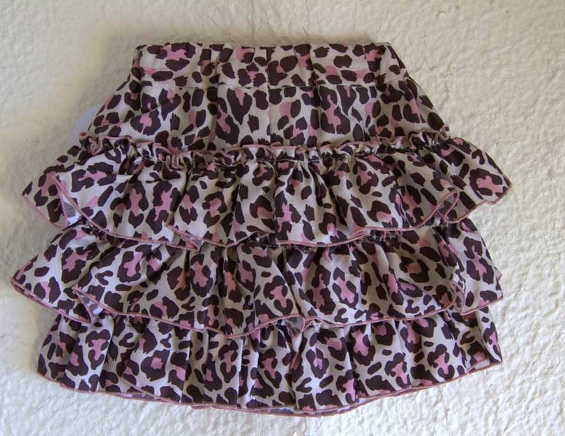 Falda volantes en estampado animal print marrón y rosa sobre fondo beige, cintura engomada y cascada de 4 volantes ribeteados todos ellos con rulo rosa empolvado, al igual que el lazo de bambula que presenta en la parte central de la cintura. Esta falda es ideal para combinar con  cualquiera de los modelos de sudadera de animal print  o la sudadera rosa de tul de la misma colección.
