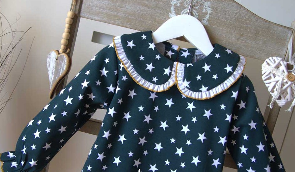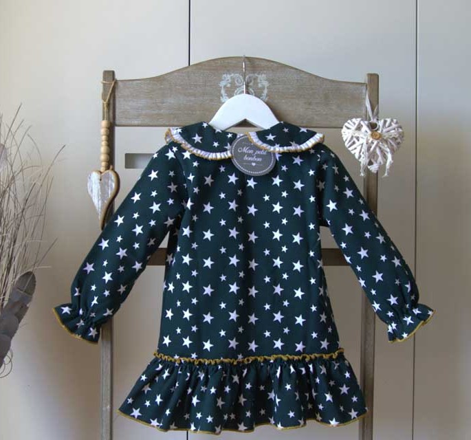 Vestido corte evasé y punto roma color verde botella en estampado de estrellas color blanco. Cuello bebé ribeteado en color blanco y mostaza. Bajos de volante superpuesto en ondas en el bajo con ribete en tono mostaza. Goma en puño.