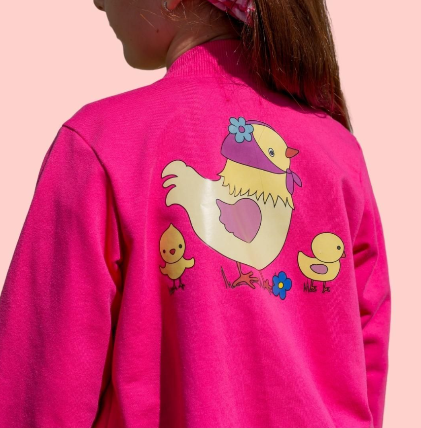 Bomber en color rosa fucsia con ilustración por detrás de una gallina con sus pollitos y flores en tonos amarillo, rosa, azul y marrón. Mangas, cintura y cuello elásticos. Apertura delantera mediante cremallera.