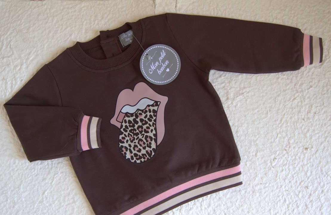 Sudadera en color marrón chocolate. Ilustración central  de labios rosas a lo modo «Rolling Stones» con lengua animal print. Forro interior en un afelpado suave y elástico tricolor en tonos rosa, beige y marrón en el bajo y en los puños. Esta sudadera, es ideal para combinar con la falda, short o braga falda animal print de la colección.