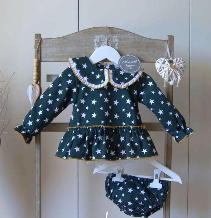 Jesusito corte evasé y punto roma color verde botella en estampado de estrellas color blanco. Cuello bebé ribeteado en color blanco y mostaza. Bajos de volante superpuesto en ondas en el bajo con ribete en tono mostaza. Goma en puño y braguita en mismo estampado.