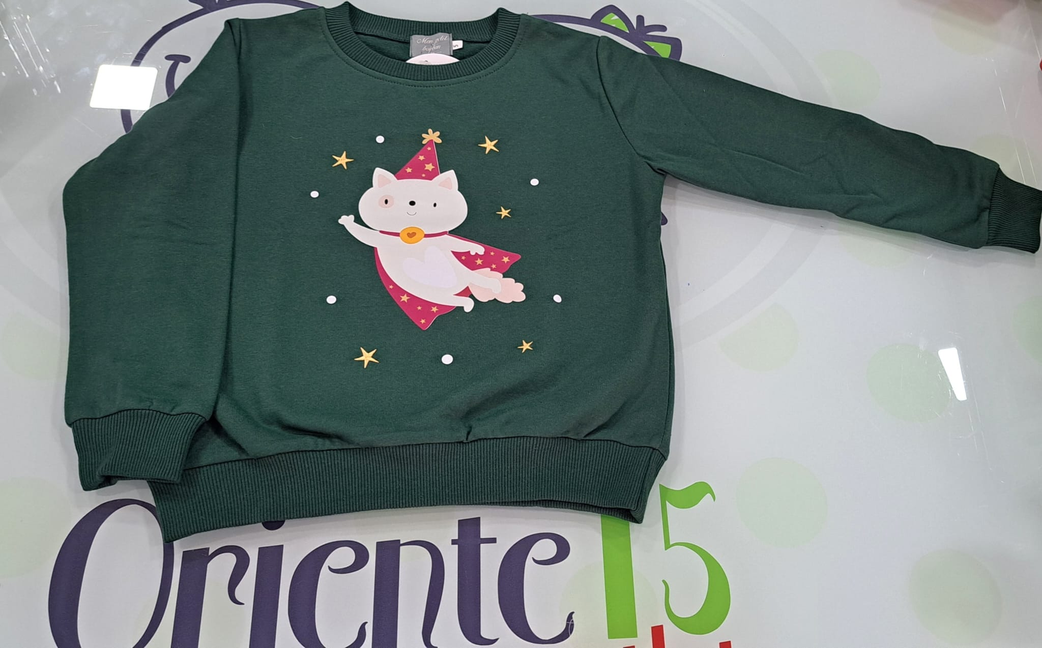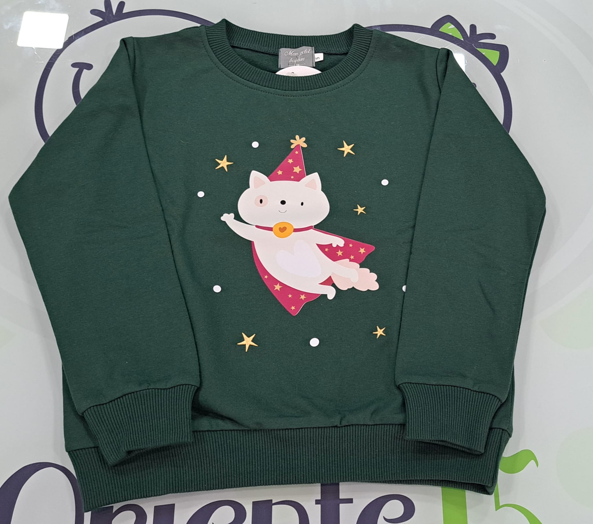 Sudadera verde botella con ilustracion de gato mago y forro interior de felpa