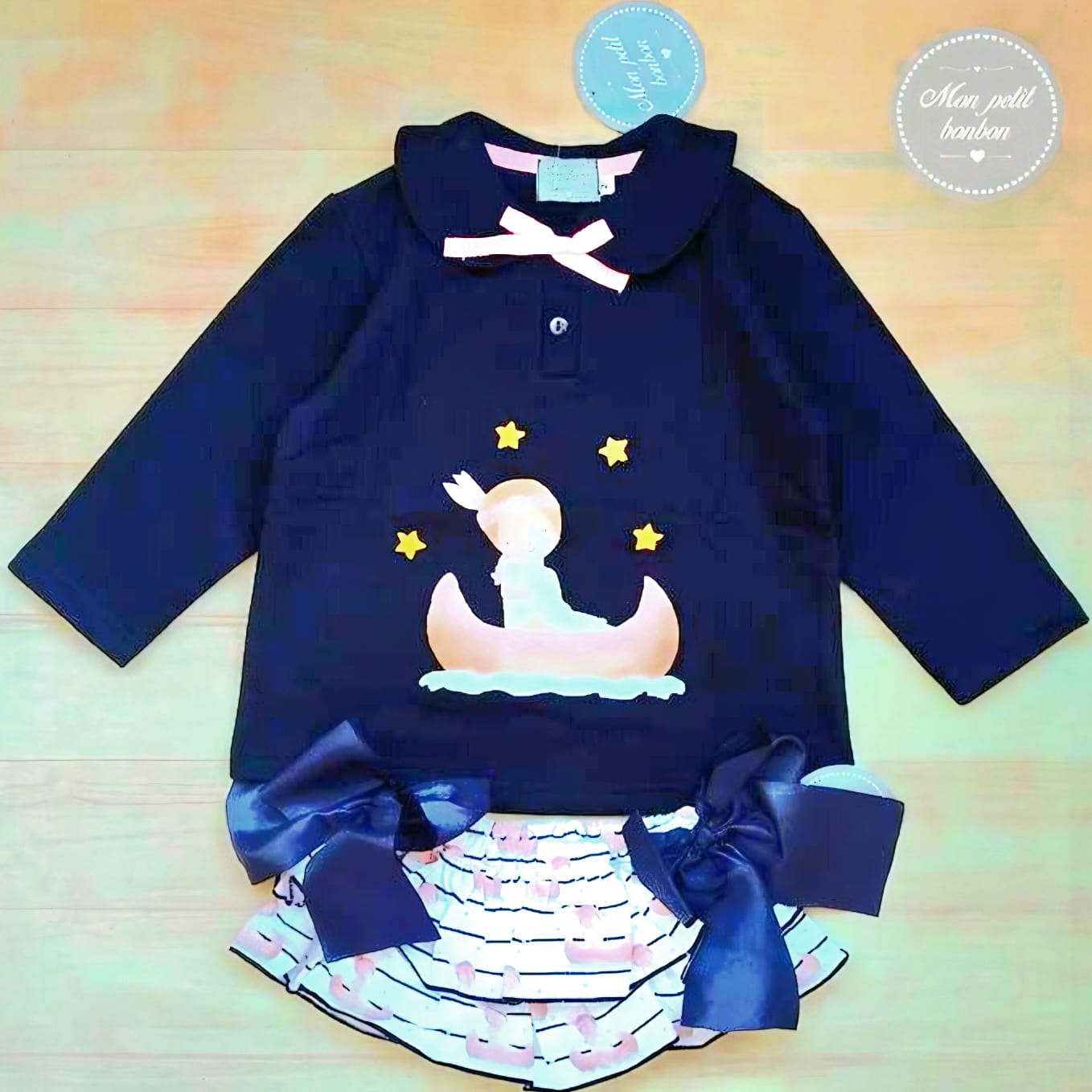 Sudadera azul marino, ilustración centras de india en canoa con estrellas amarillas, cuello bebé con cordón rosa y abertura de botones. Ideal para combinar con la falda o braga falda de la misma colección.