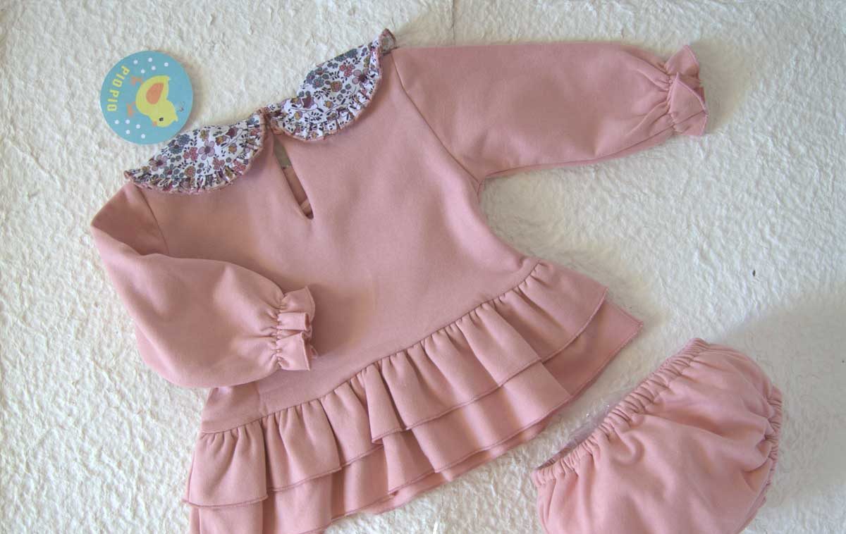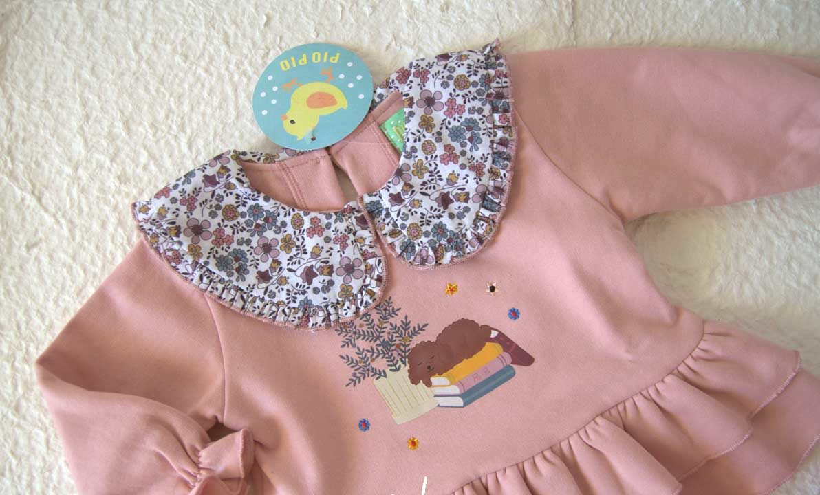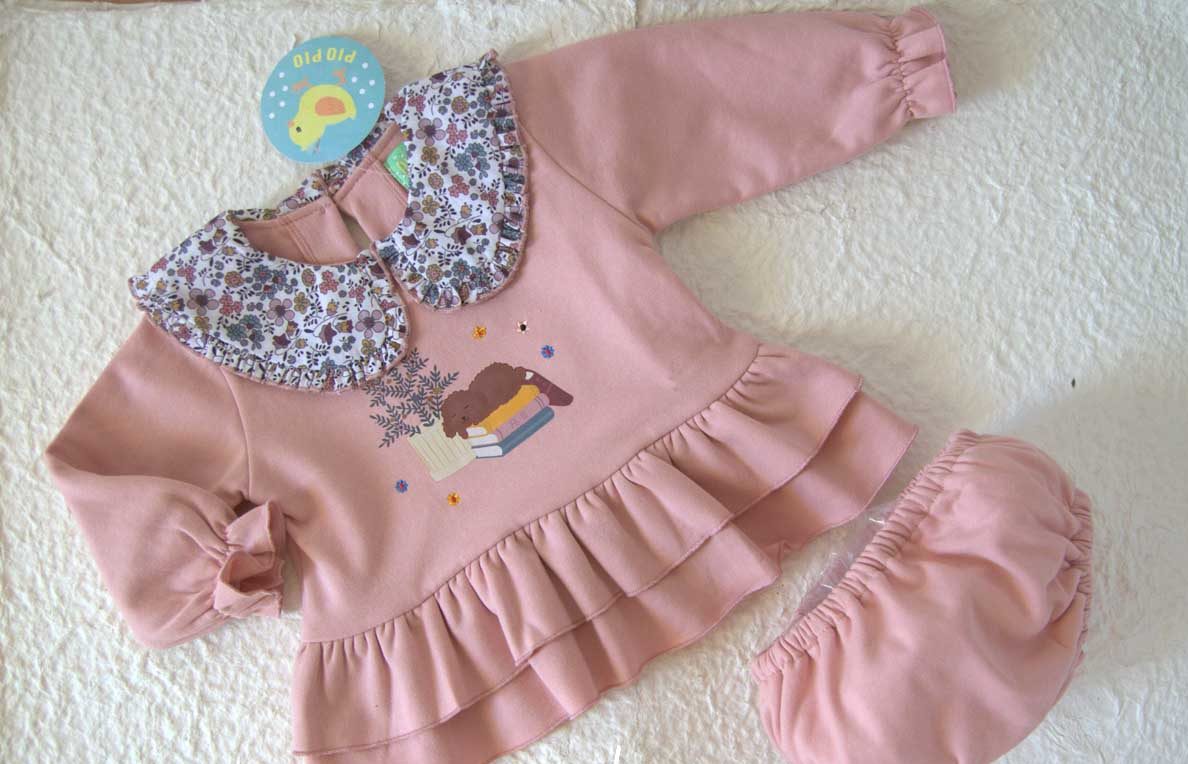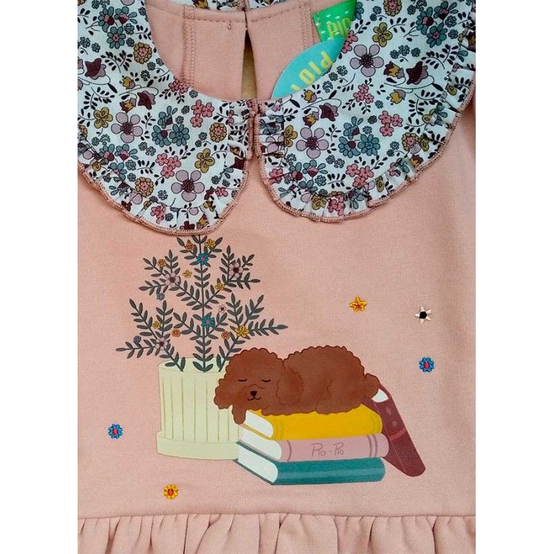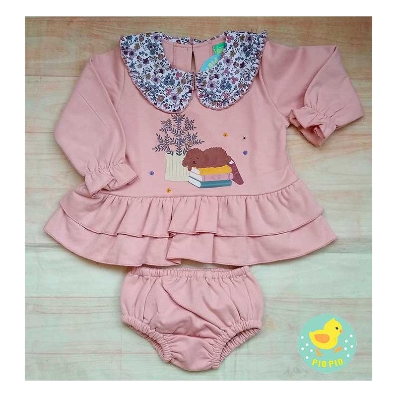 Jesusito color rosa empolvado, ilustración central de perro estudioso y  cuello bebé en estampado de flores. Abertura con botón por detrás del cuello, puño con elástico, volantes en bajos y forro interior afelpado. Braguita en mismo tono.